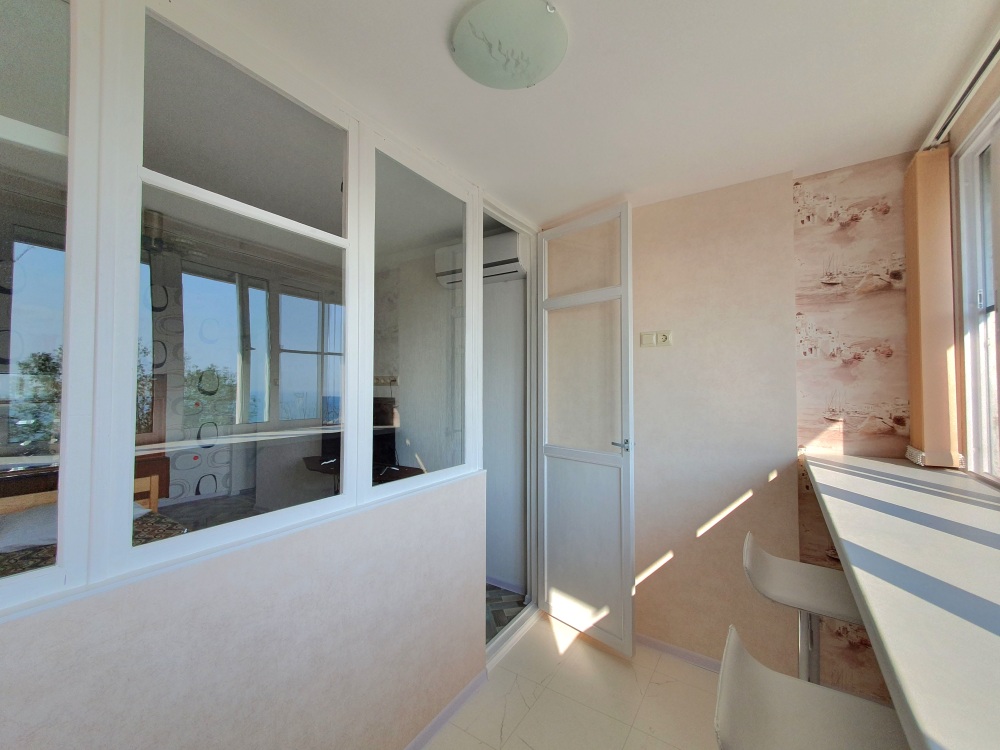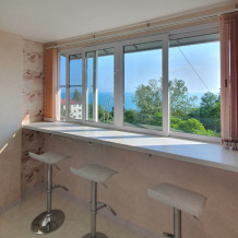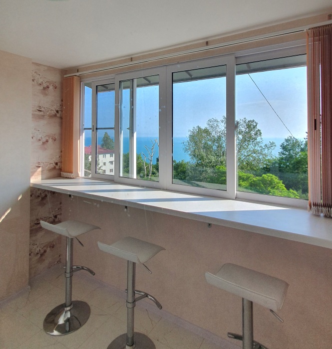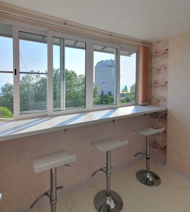 Изюминка нашей квартиры прямой вид на море из всех окон, а также эксклюзивная лаунж зона с трехметровой барной стойкой и панорамным видом на море и город.