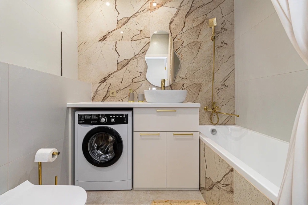 Современная ванная комната с эксклюзивными косметическими принадлежностями.