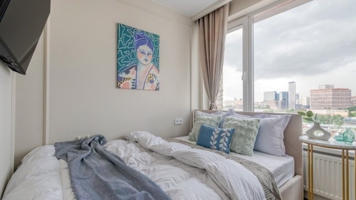 Стильная уютная студия в ЖК «Мята». Большие окна. Качественная дорогая мебель и техника. Интерьер продуман до мелочей. Апартаменты, откуда не хочется уезжать. Метро «Хорошевская» (10 минут пешком).