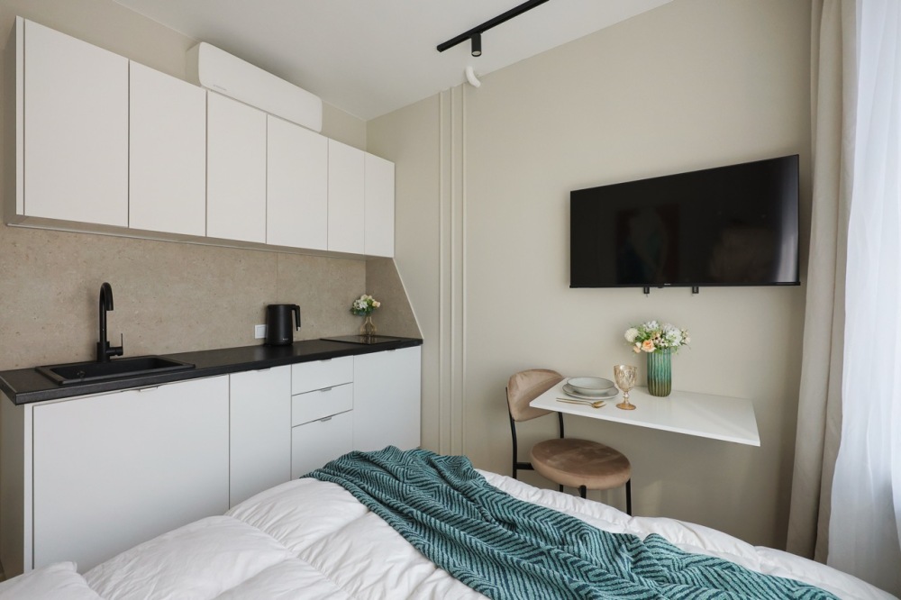 Большие окна. Качественная дорогая мебель и техника. Интерьер продуман до мелочей. Апартаменты, откуда не хочется уезжать.