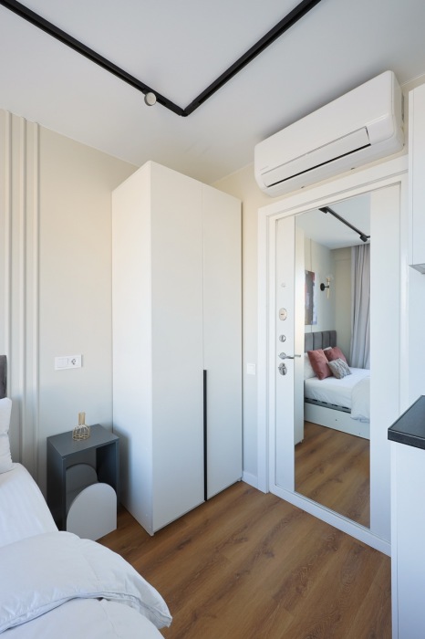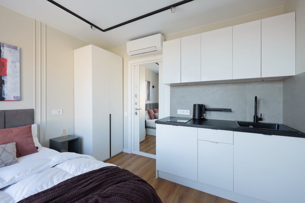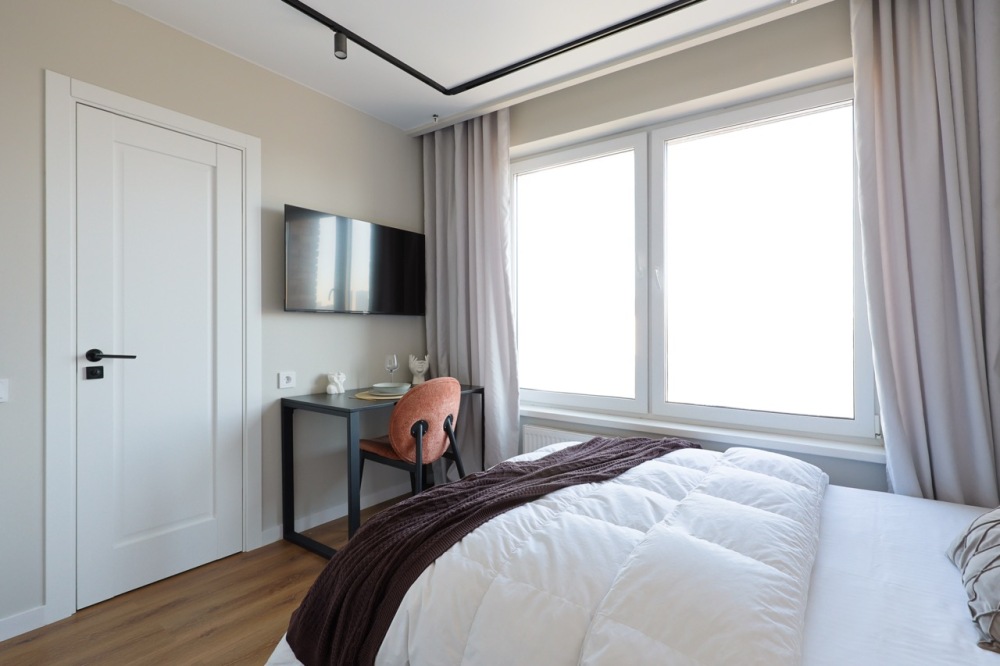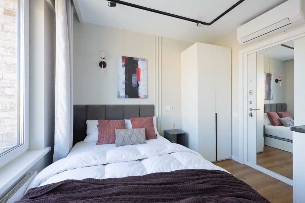 Стильная уютная студия в ЖК «Мята». Большие окна. Качественная дорогая мебель и техника. Интерьер продуман до мелочей. Апартаменты, откуда не хочется уезжать. Метро «Хорошевская» (10 минут пешком).