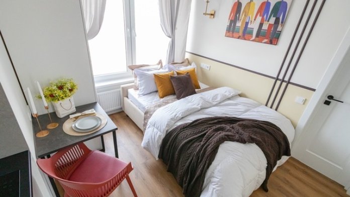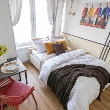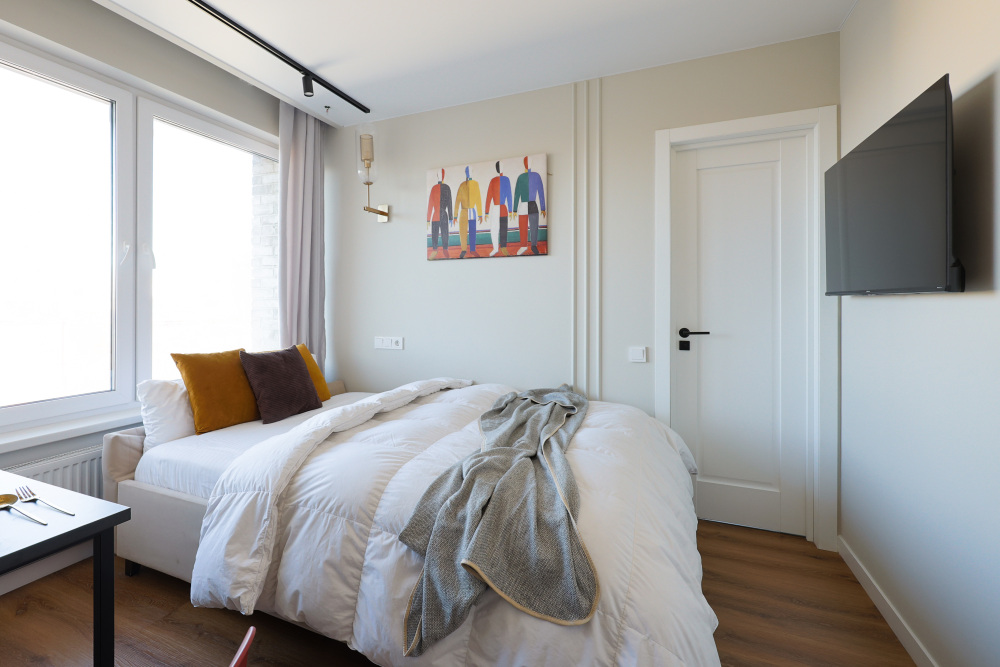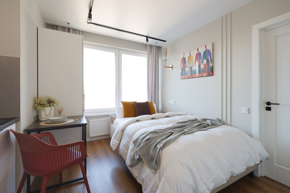 Стильная уютная студия в ЖК «Мята». Большие окна. Качественная дорогая мебель и техника. Интерьер продуман до мелочей. Апартаменты, откуда не хочется уезжать. Метро «Хорошевская» (10 минут пешком).