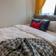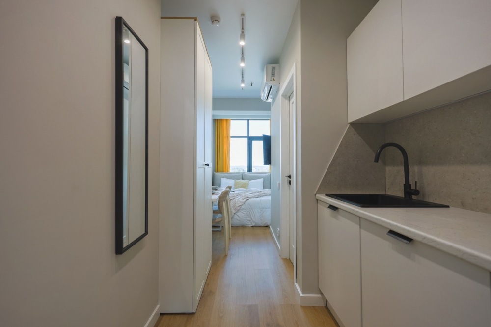 Современная студия в ЖК «Sky Skolkovo». Большие окна. Качественная дорогая мебель и техника. Интерьер продуман до мелочей. Апартаменты, откуда не хочется уезжать.
