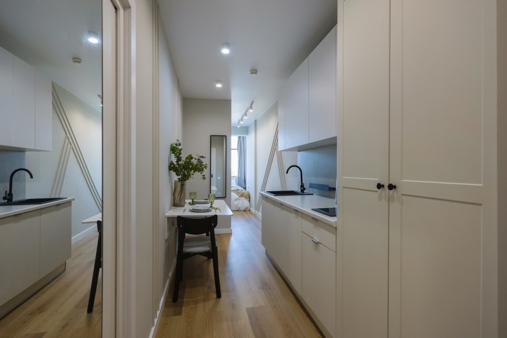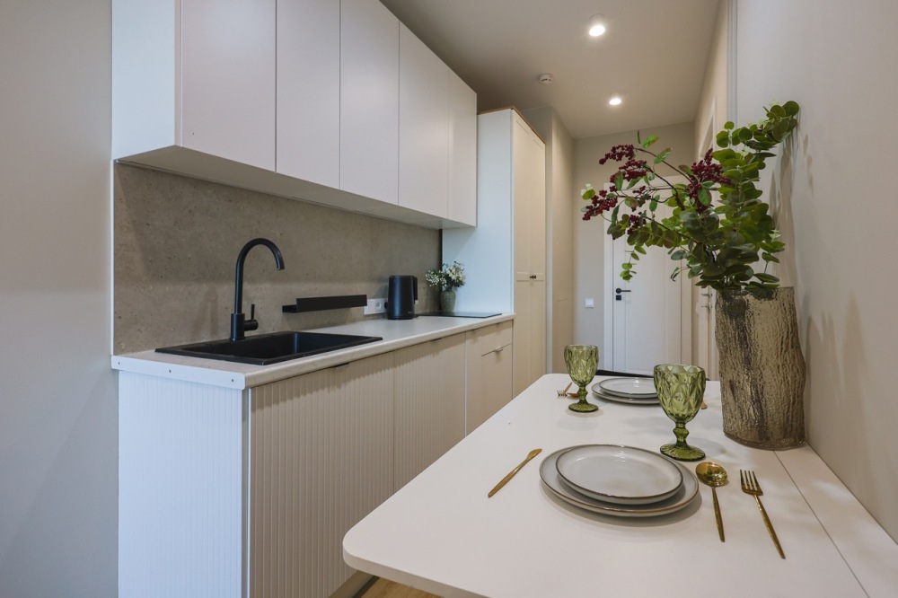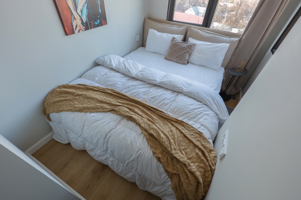 Современная студия в ЖК «Sky Skolkovo». Большие окна. Качественная дорогая мебель и техника. Интерьер продуман до мелочей. Апартаменты, откуда не хочется уезжать.