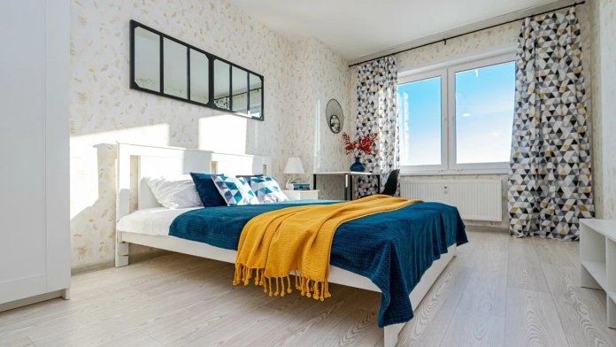 - Двуспальная кровать с ортопедическим матрасом и нежным постельным бельём из сатина