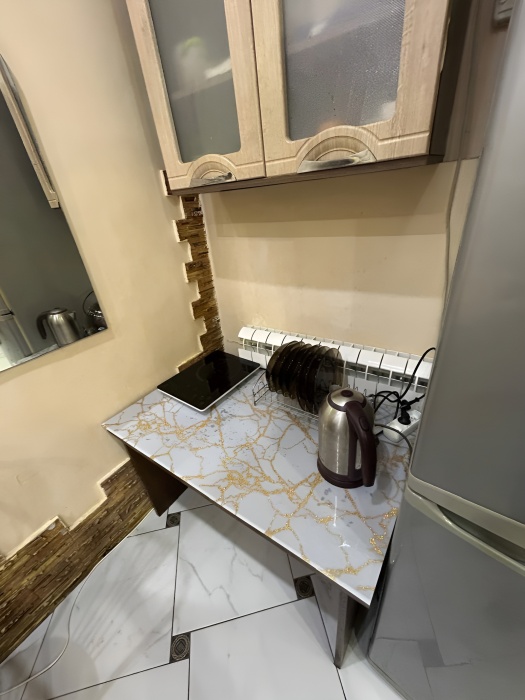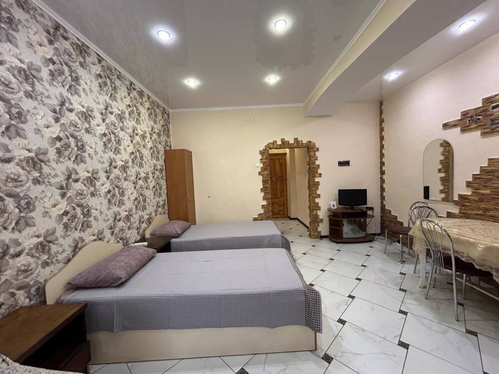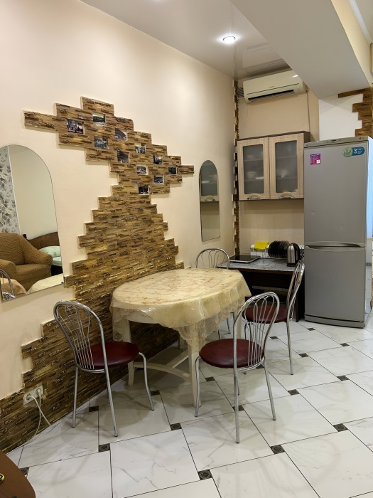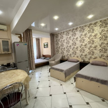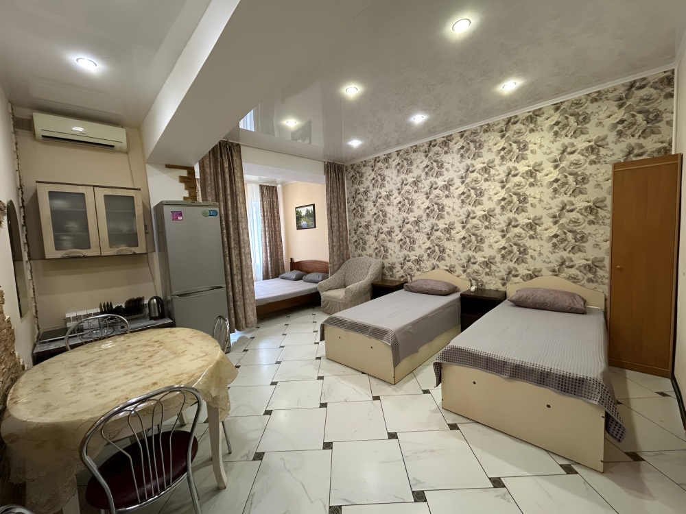 Внутри квартиры в Ялте вы найдете все необходимое для комфортного проживания - отличное Цифровое ТВ, Wi-Fi, холодильник, кондиционер, сан. узел и душ, а также круглосуточную горячую и холодную воду. Более того, здесь есть кухонный уголок с индукционной плитой и всей необходимой посудой. Студия вмещает до 5 человек и имеет широкую двуспальную кровать, две односпальные кровати и даже кресло-кровать.