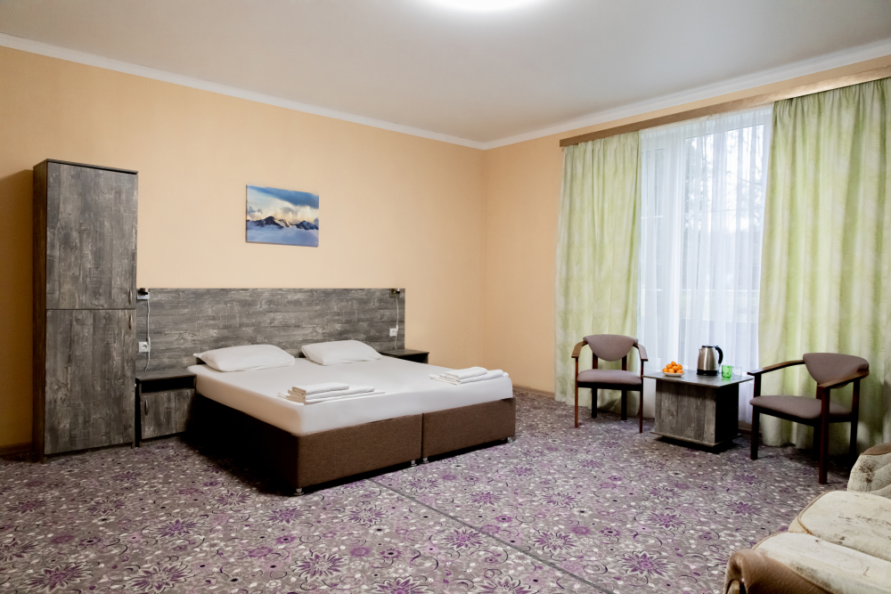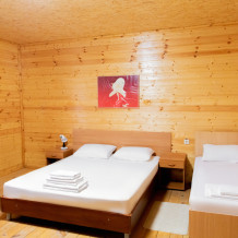 Просторный 2х-комнатный номер создан для комфортного отдыха всей семьи. В первой комнате широкая 2-спальная кровать (с возможностью разделения на 2 односпальные). Во второй комнате предусмотрена 2х-ярусная кровать. Номер оснащён телевизором, скоростным Wi-Fi, мини-холодильником, электрическим чайником, кувшином и стаканами, уличной сушилкой.