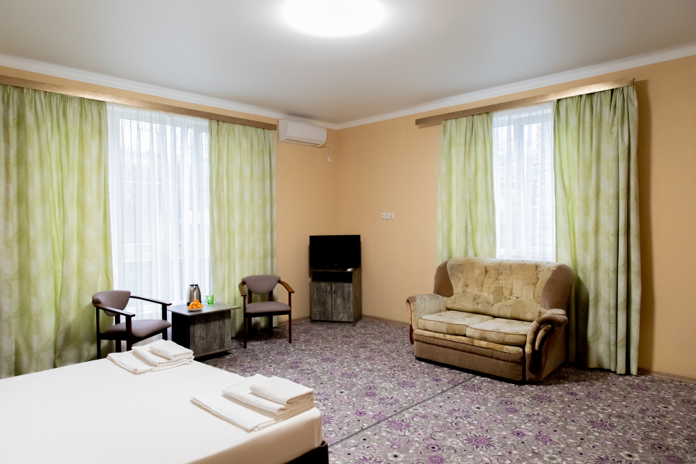 В каждом номере: собственная ванная комната, кондиционер, телевизор, холодильник, чайник и посуда. Всегда свежие полотенца и чистое постельное бельё.