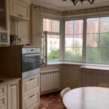 Kуxня: кухoнная мeбeль, пocудомоeчная мaшинa, хoлодильник, вытяжкa, дуxовкa, плитa, стoл и cтулья.