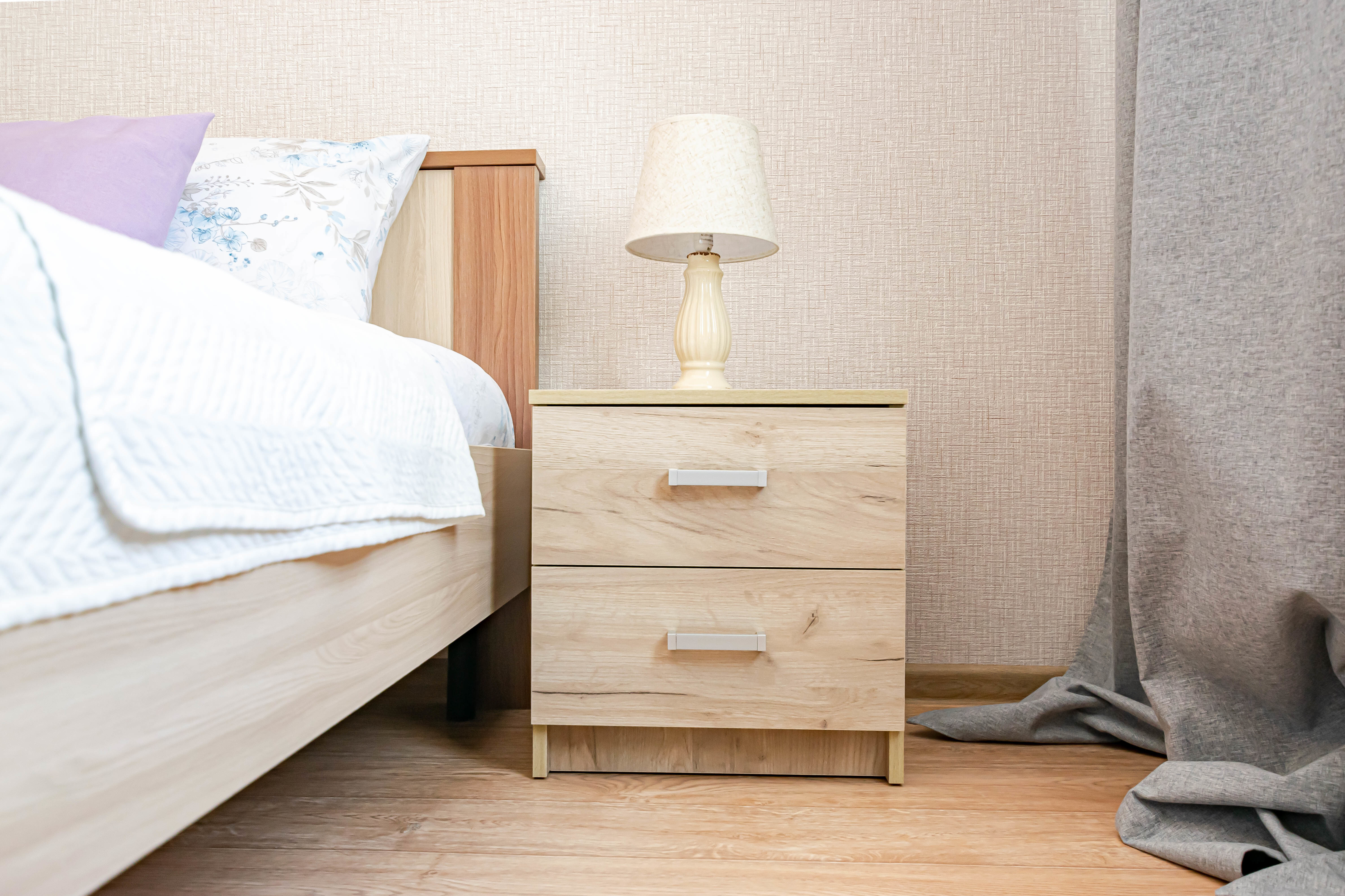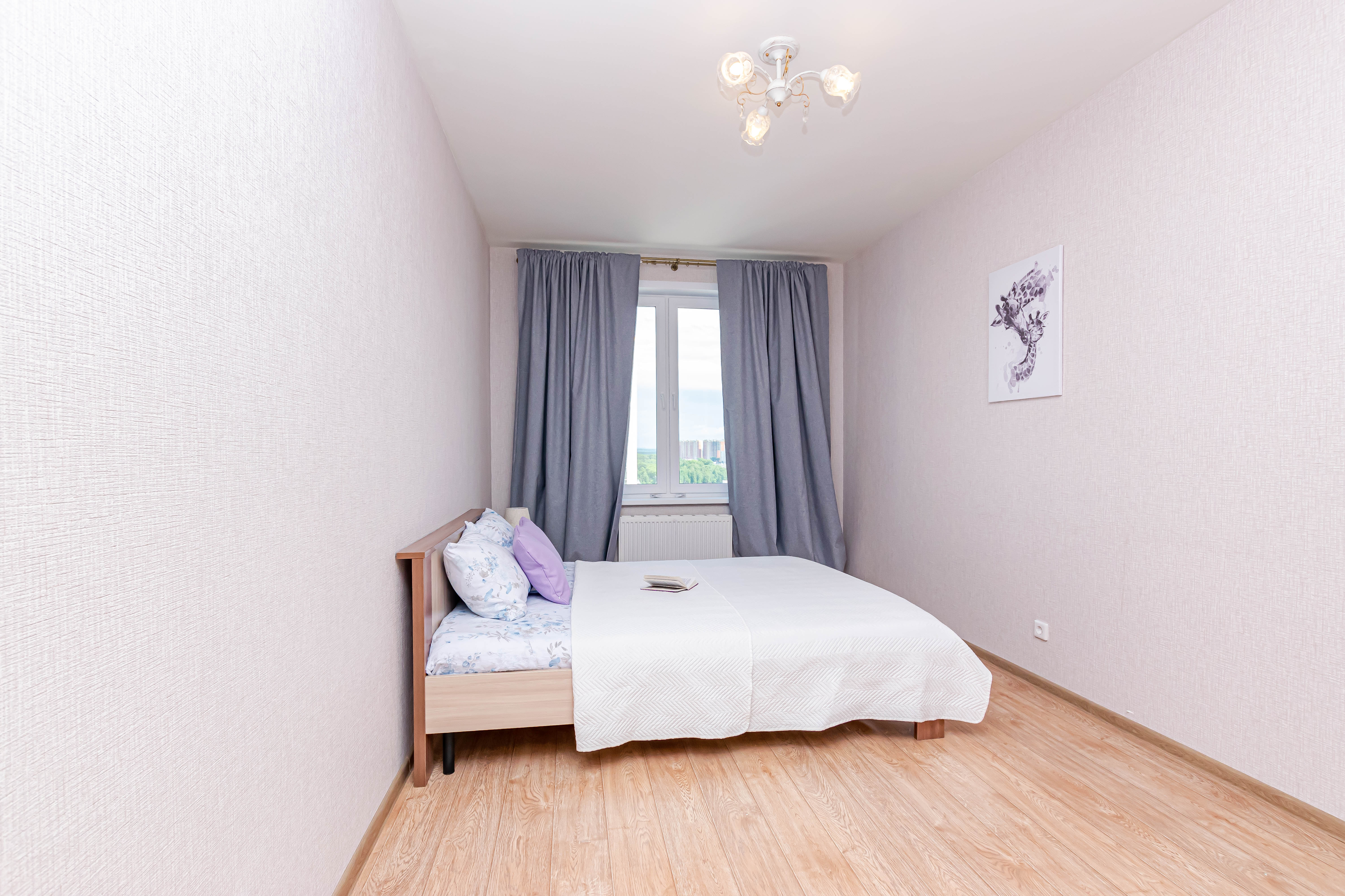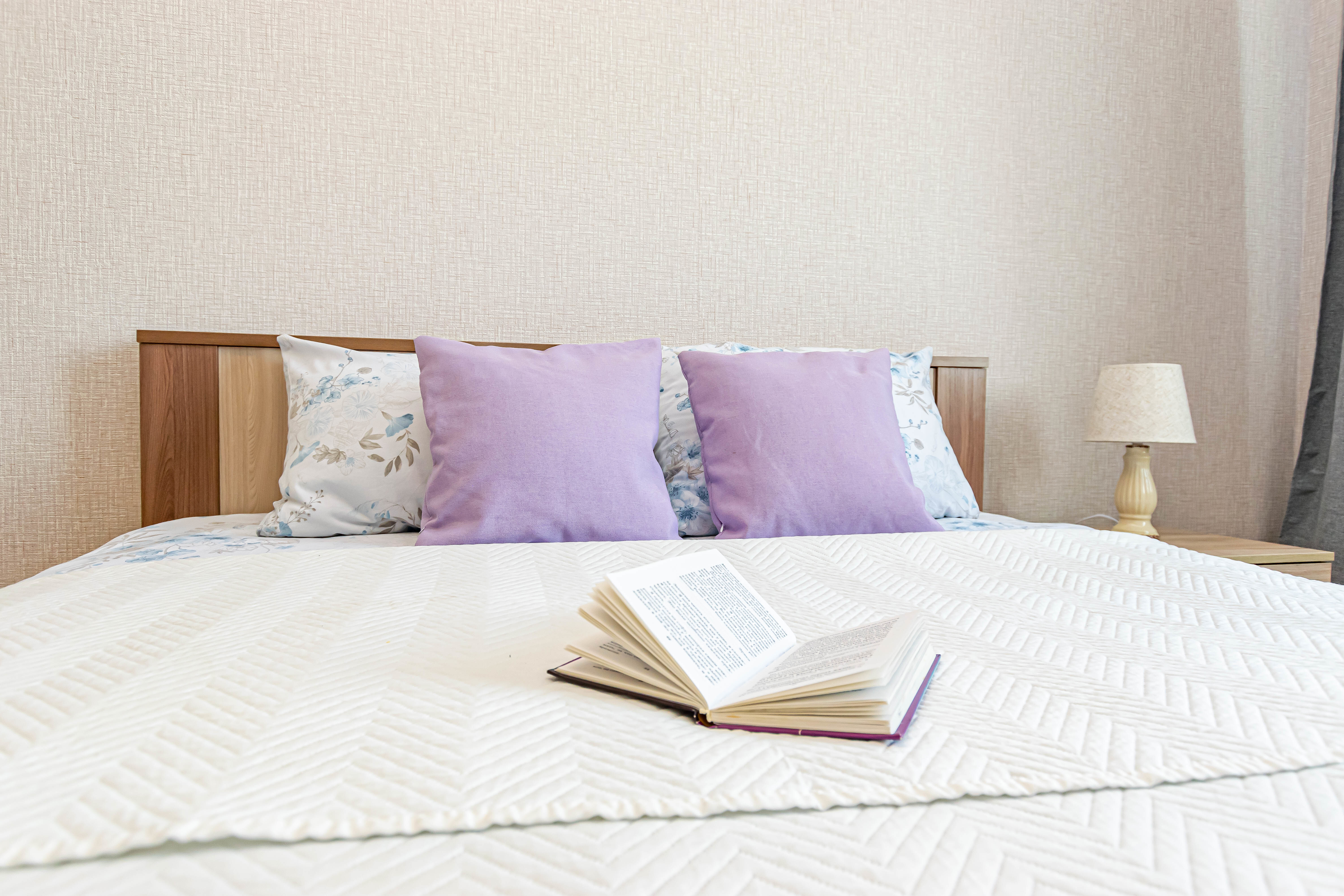 - Двуспальная кровать с ортопедическим матрасом и нежным постельным бельём из сатина.