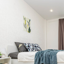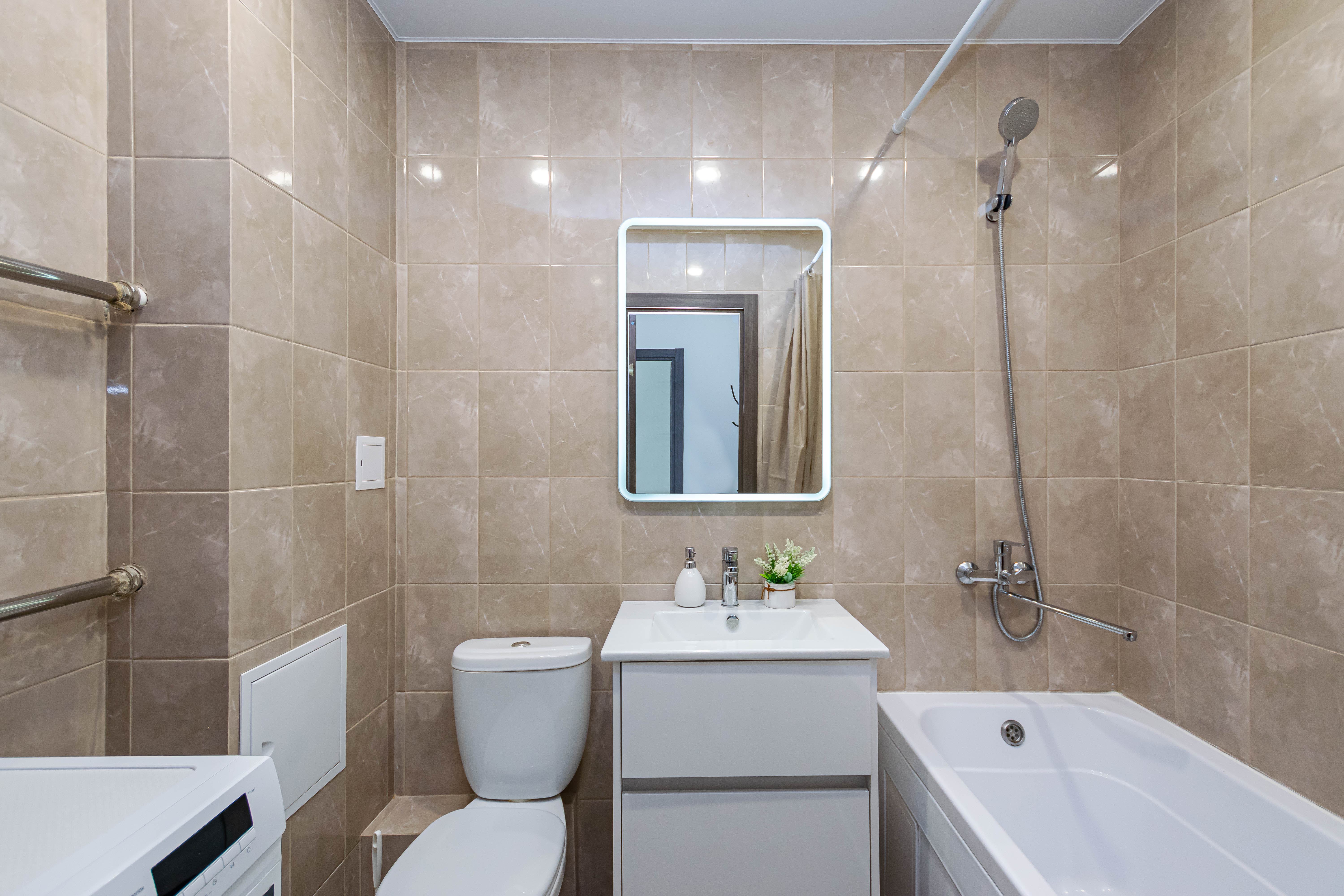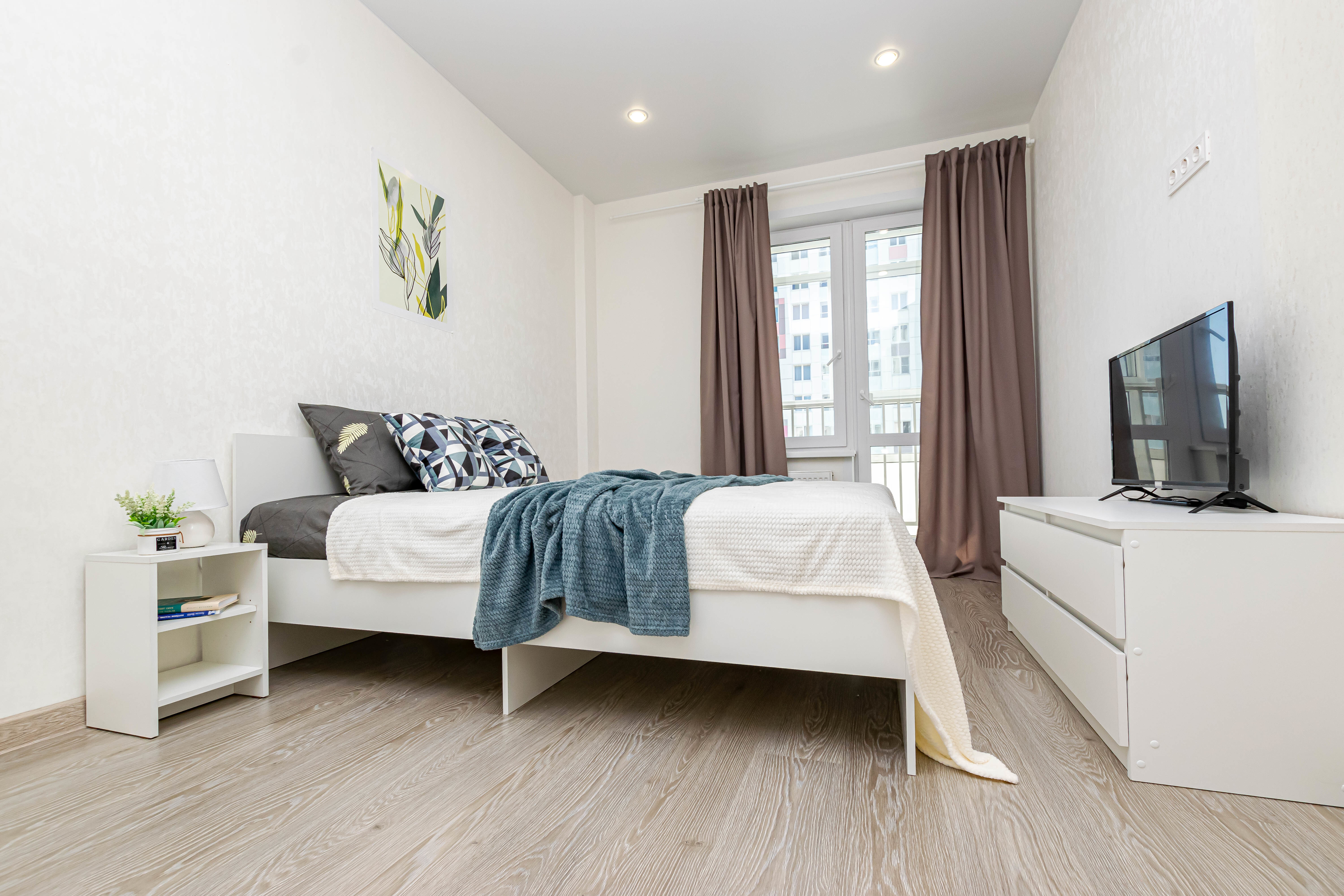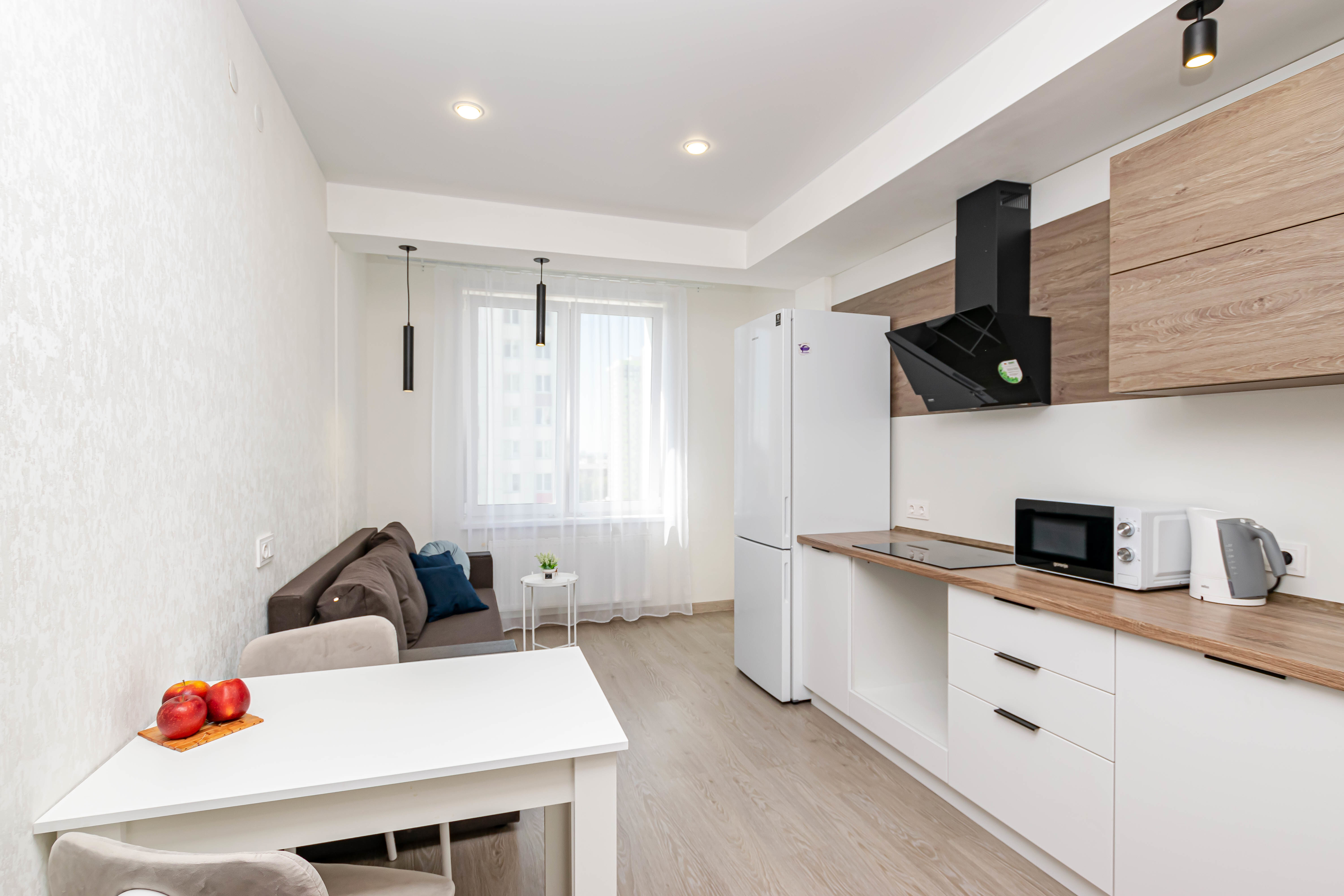 - Полный набор техники: холодильник, стиралка, фен, утюг, чайник, микроволновка, телевизор с функцией Smart-TV.
