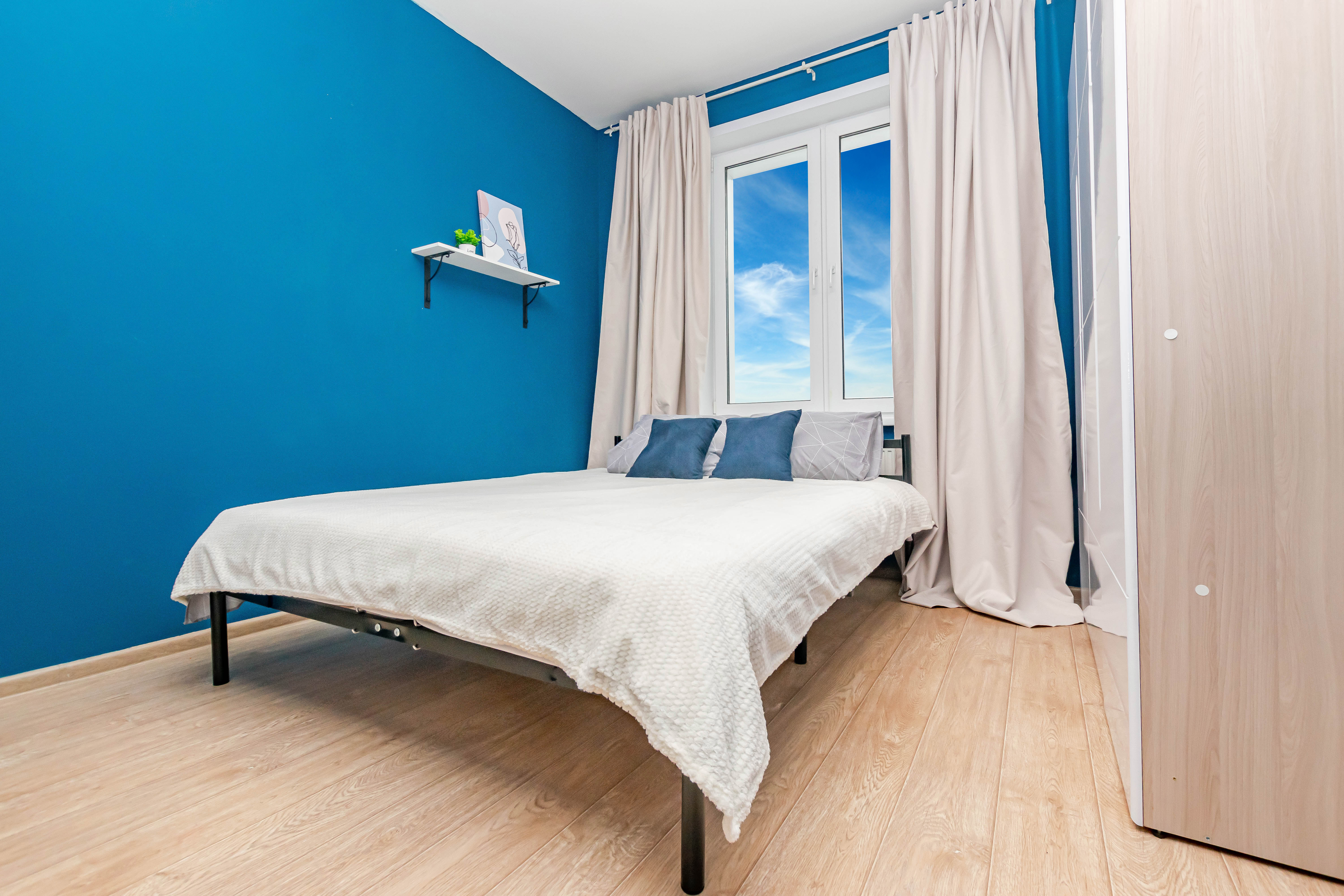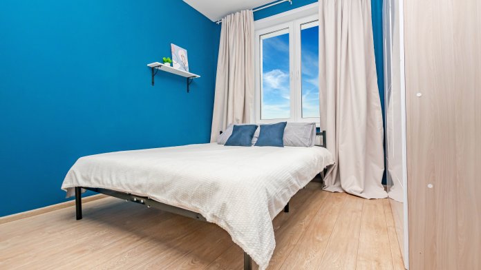 - Двуспальная кровать с ортопедическим матрасом и нежным постельным бельём из сатина.