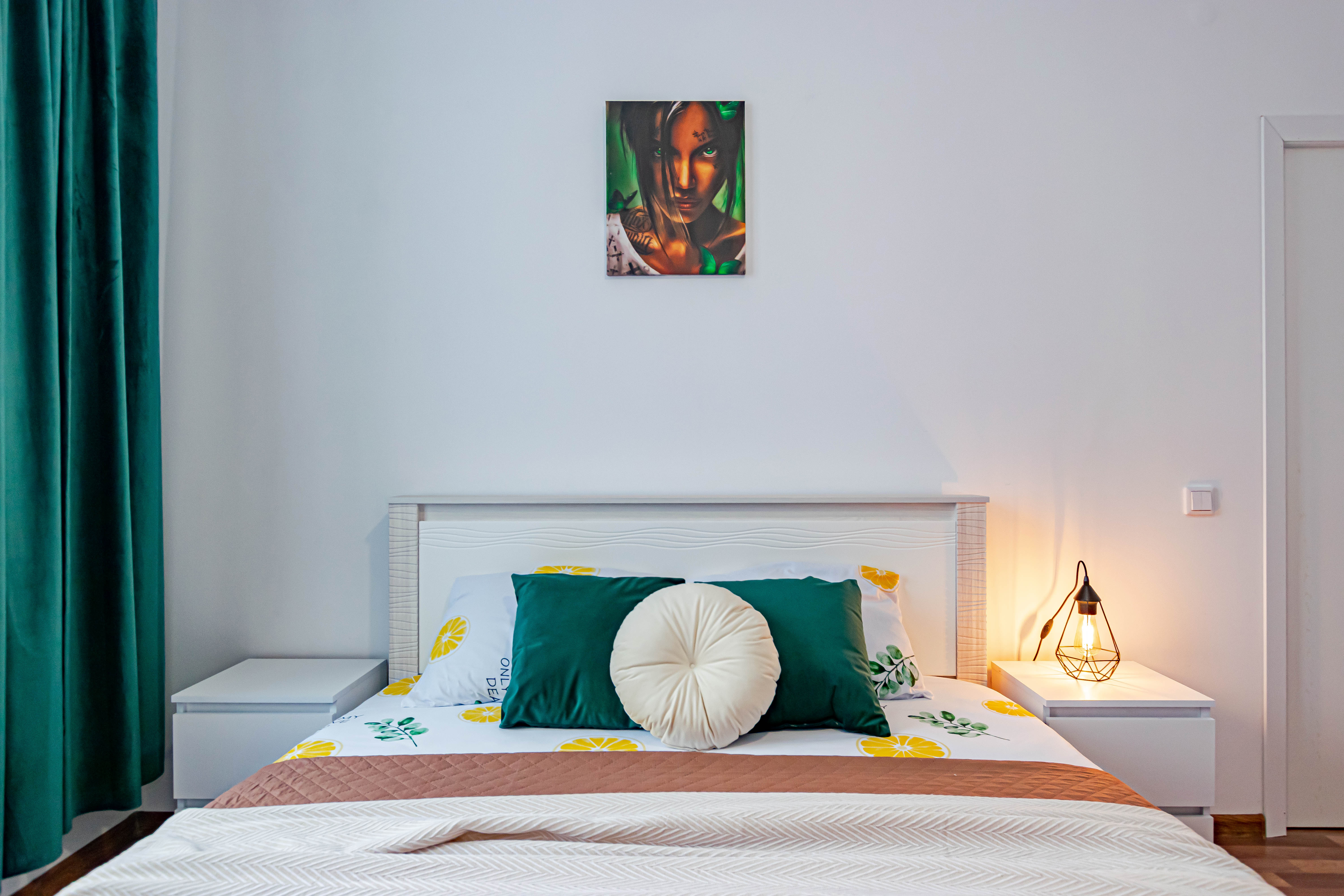 - Двуспальная кровать с ортопедическим матрасом и нежным постельным бельём из сатина