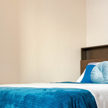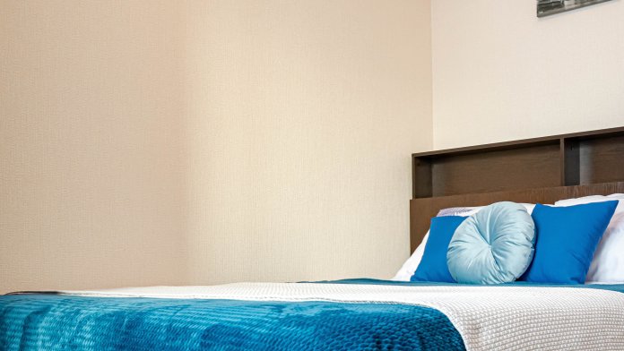- Двуспальная кровать с ортопедическим матрасом и нежным постельным бельём из сатина.