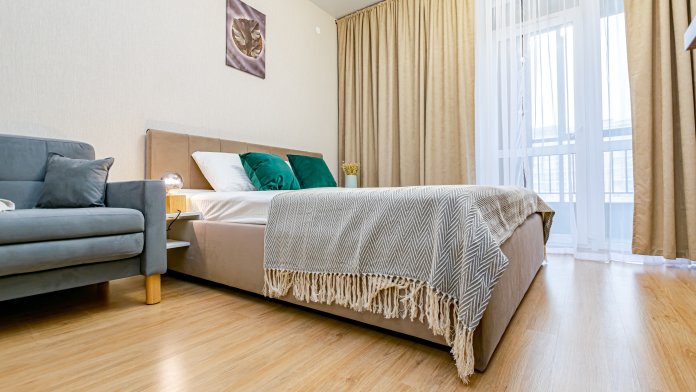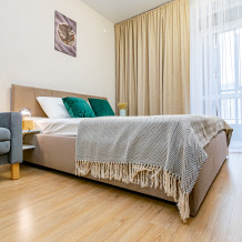 - Двуспальная кровать с ортопедическим матрасом и нежным постельным бельём из сатина.