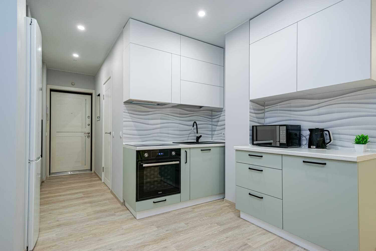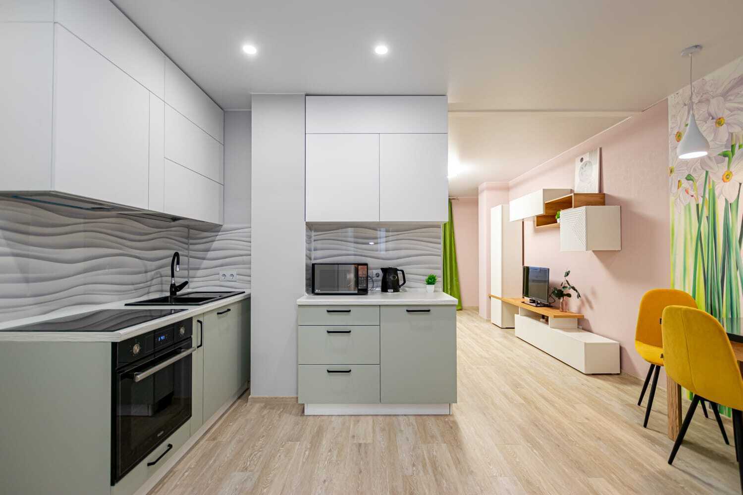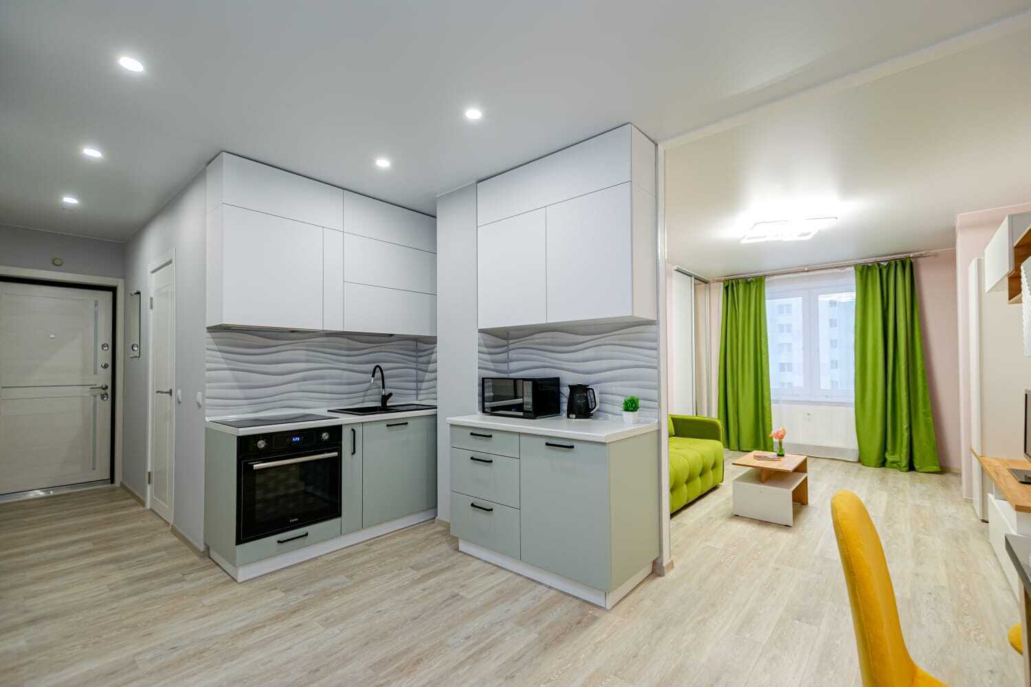 - Полный набор техники: холодильник, духовка, стиралка, фен, утюг, чайник, микроволновка, телевизор с функцией Smart-TV.
