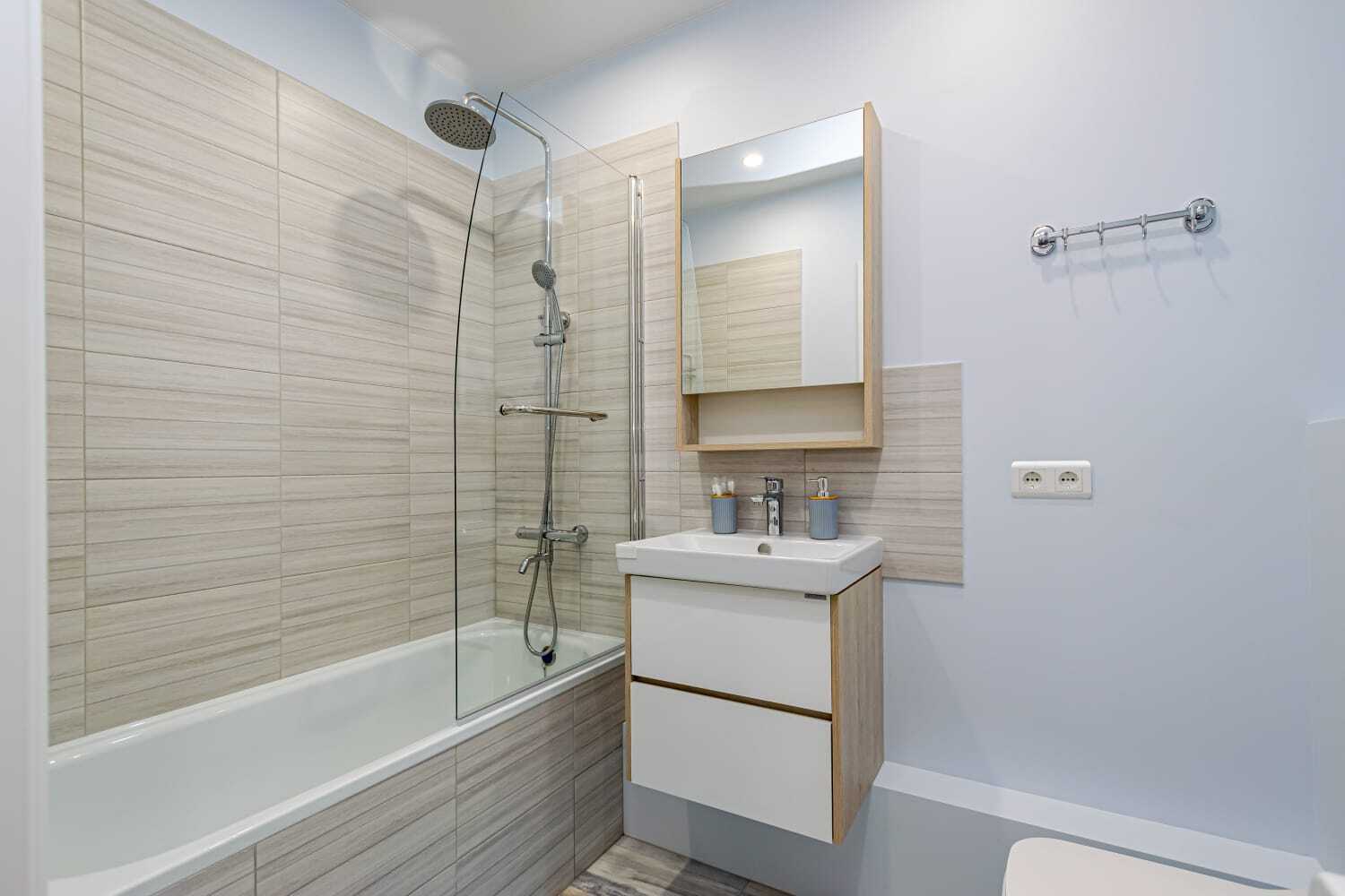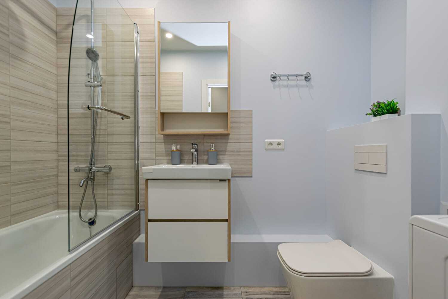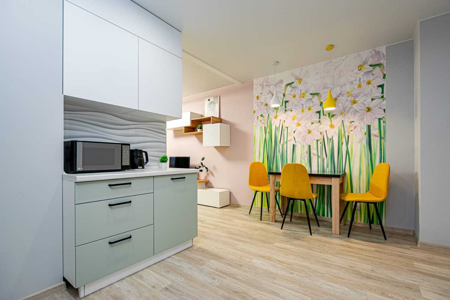 - Полный набор техники: холодильник, духовка, стиралка, фен, утюг, чайник, микроволновка, телевизор с функцией Smart-TV.