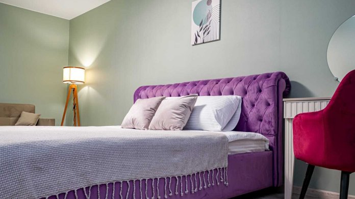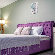 - Двуспальная кровать с ортопедическим матрасом и нежным постельным бельём из сатина.