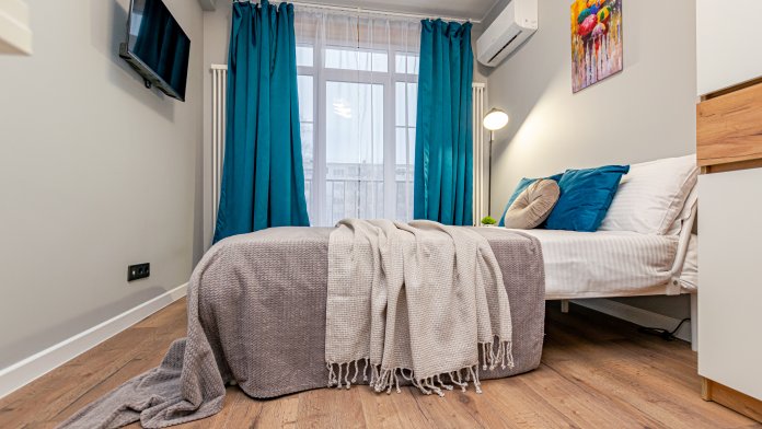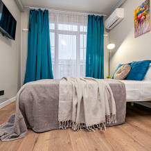 - Двуспальная кровать с ортопедическим матрасом и нежным постельным бельём из сатина.