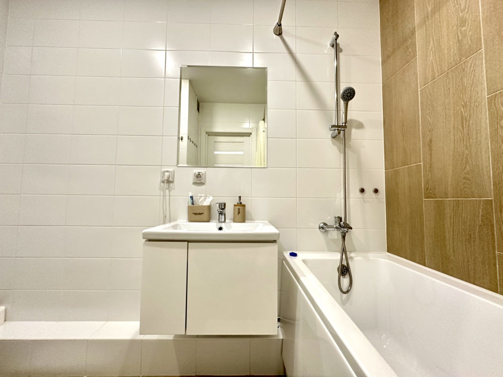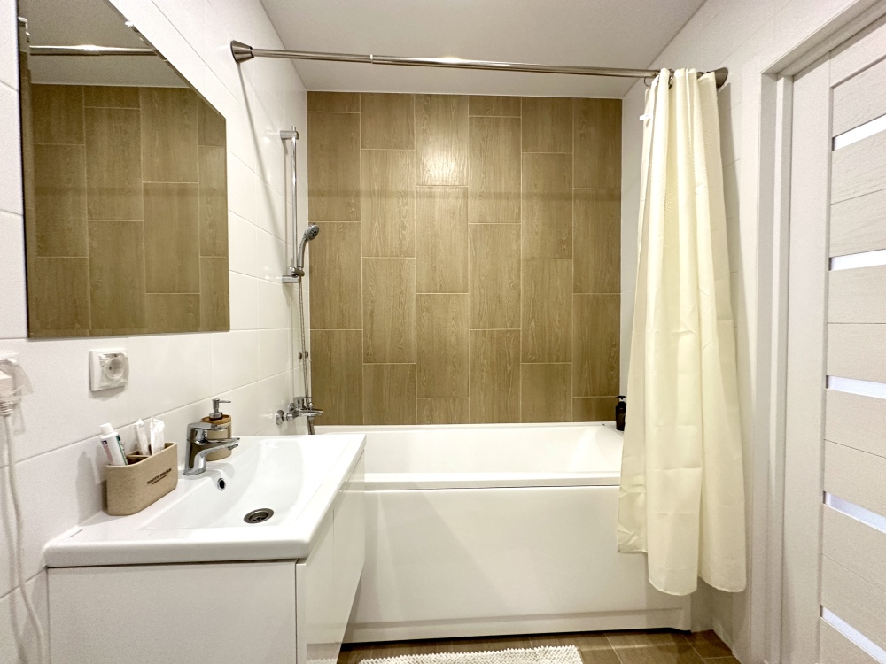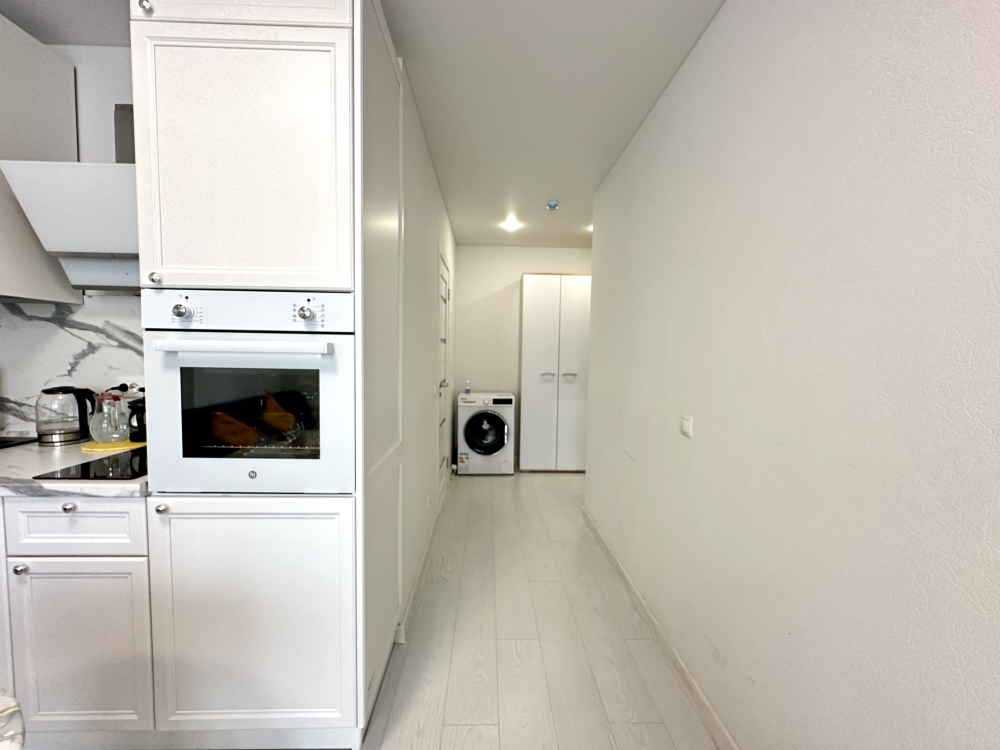- Современная бытовая техника: варочная панель, вытяжка, духовой шкаф, двухкамерный холодильник, электрочайник, СВЧ, фен, утюг, стиральная машина.