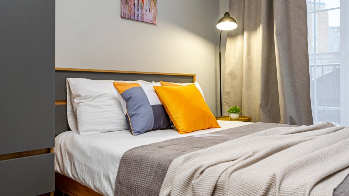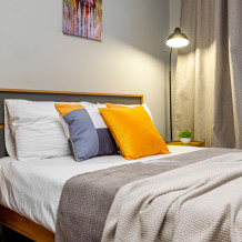 - Двуспальная кровать с ортопедическим матрасом и нежным постельным бельём из сатина.
