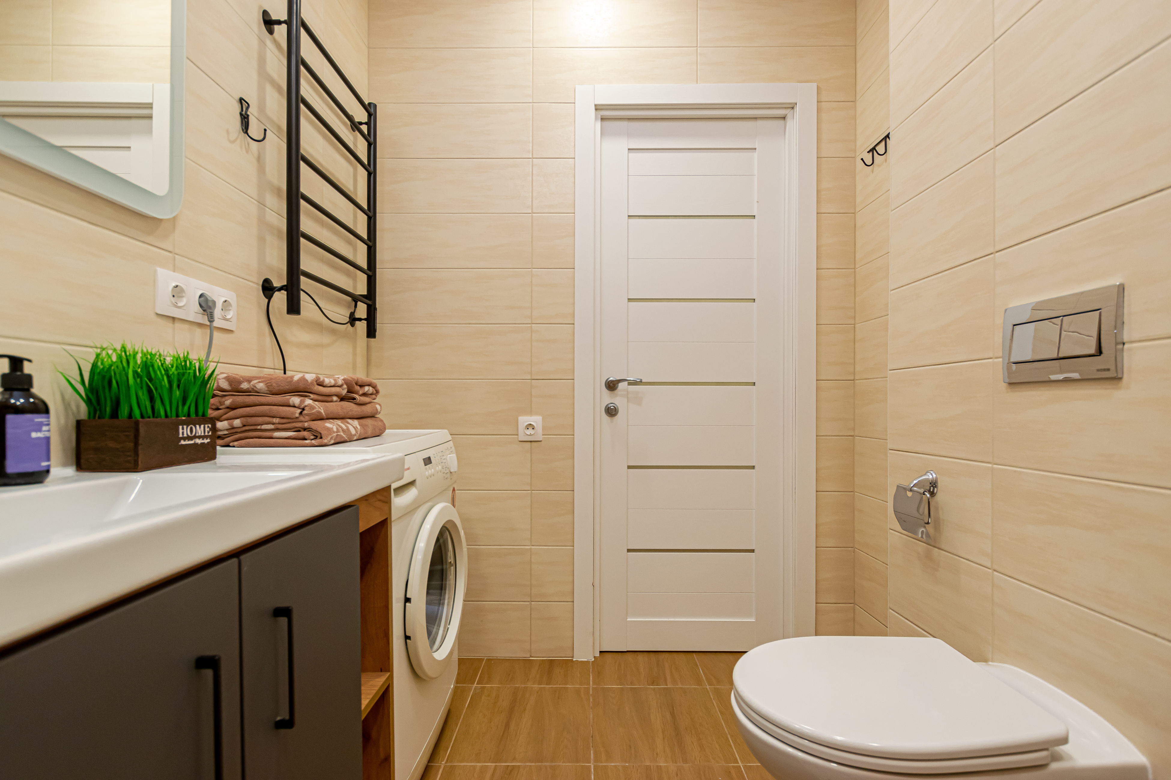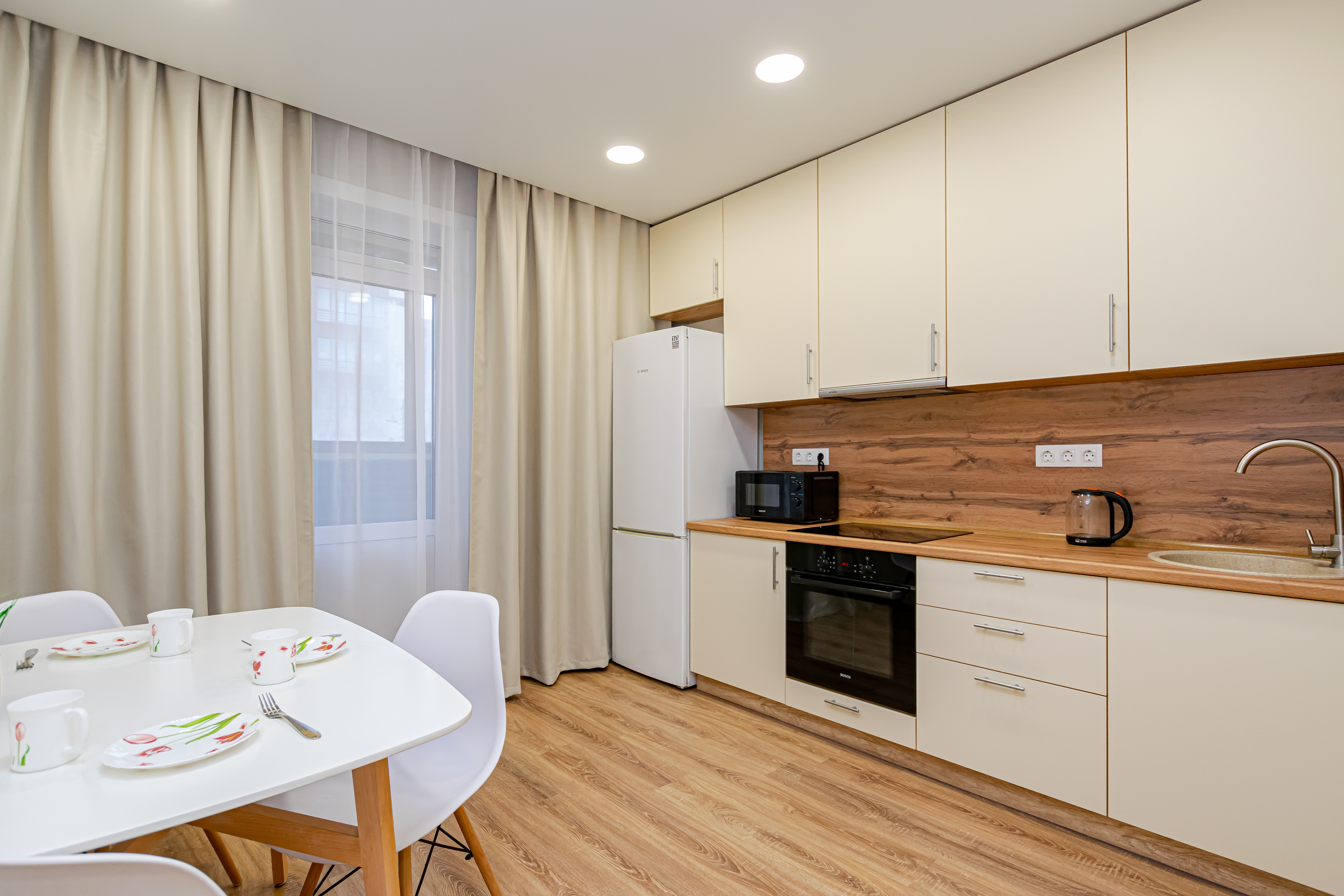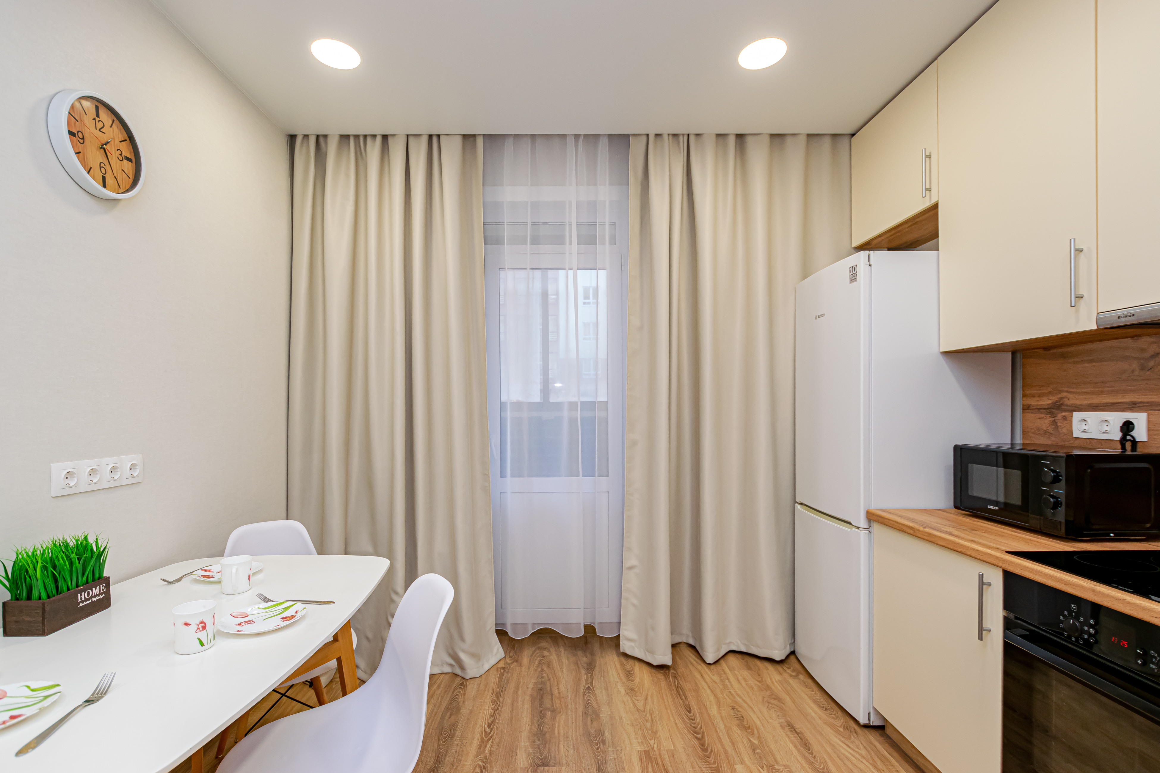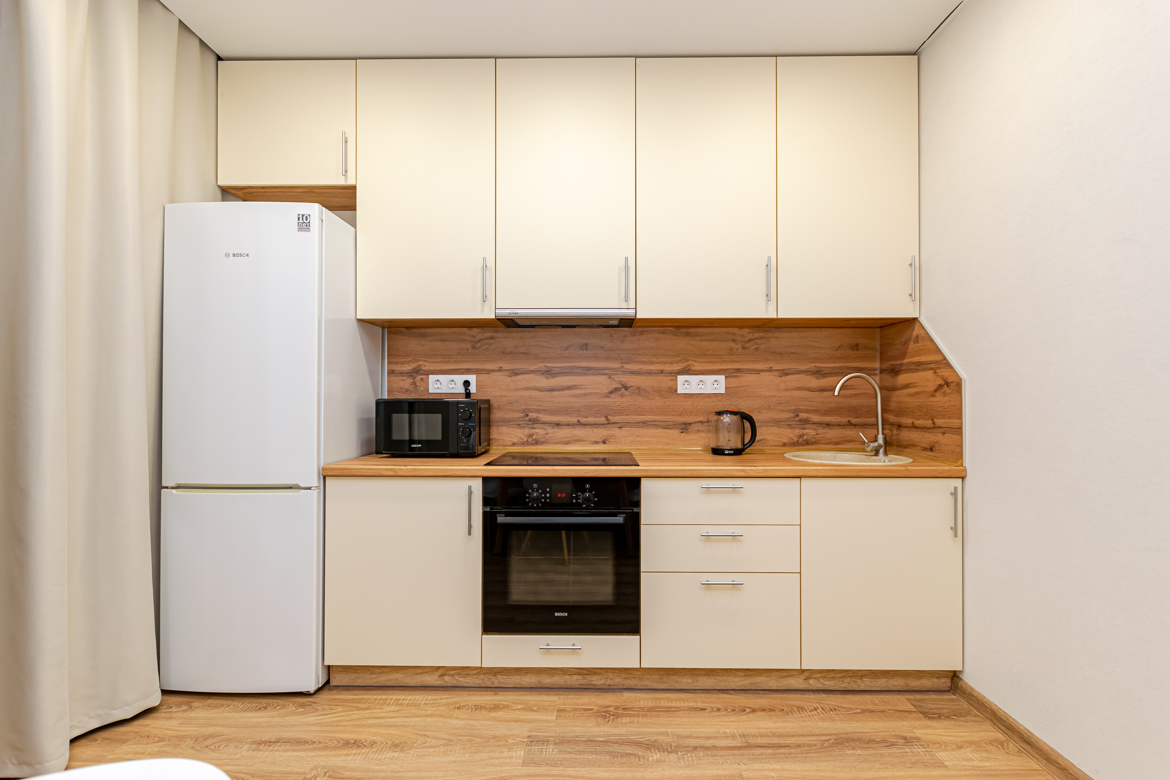 - Полный набор техники: холодильник, телевизор с функцией Smart-TV, стиралка, фен, утюг, чайник, микроволновка, водонагреватель, кондиционер.