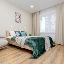 - Двуспальная кровать с ортопедическим матрасом и нежным постельным бельём из сатина.