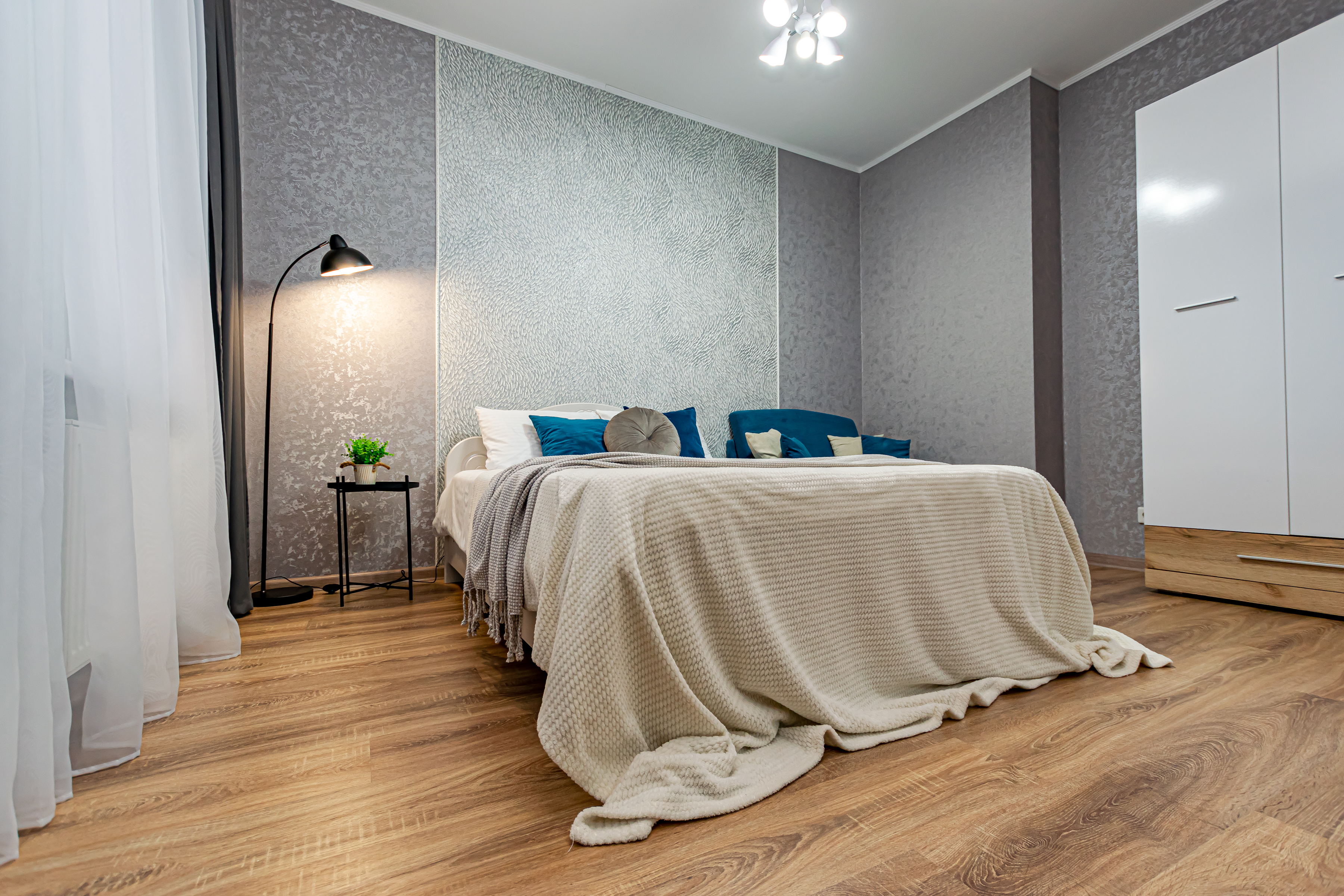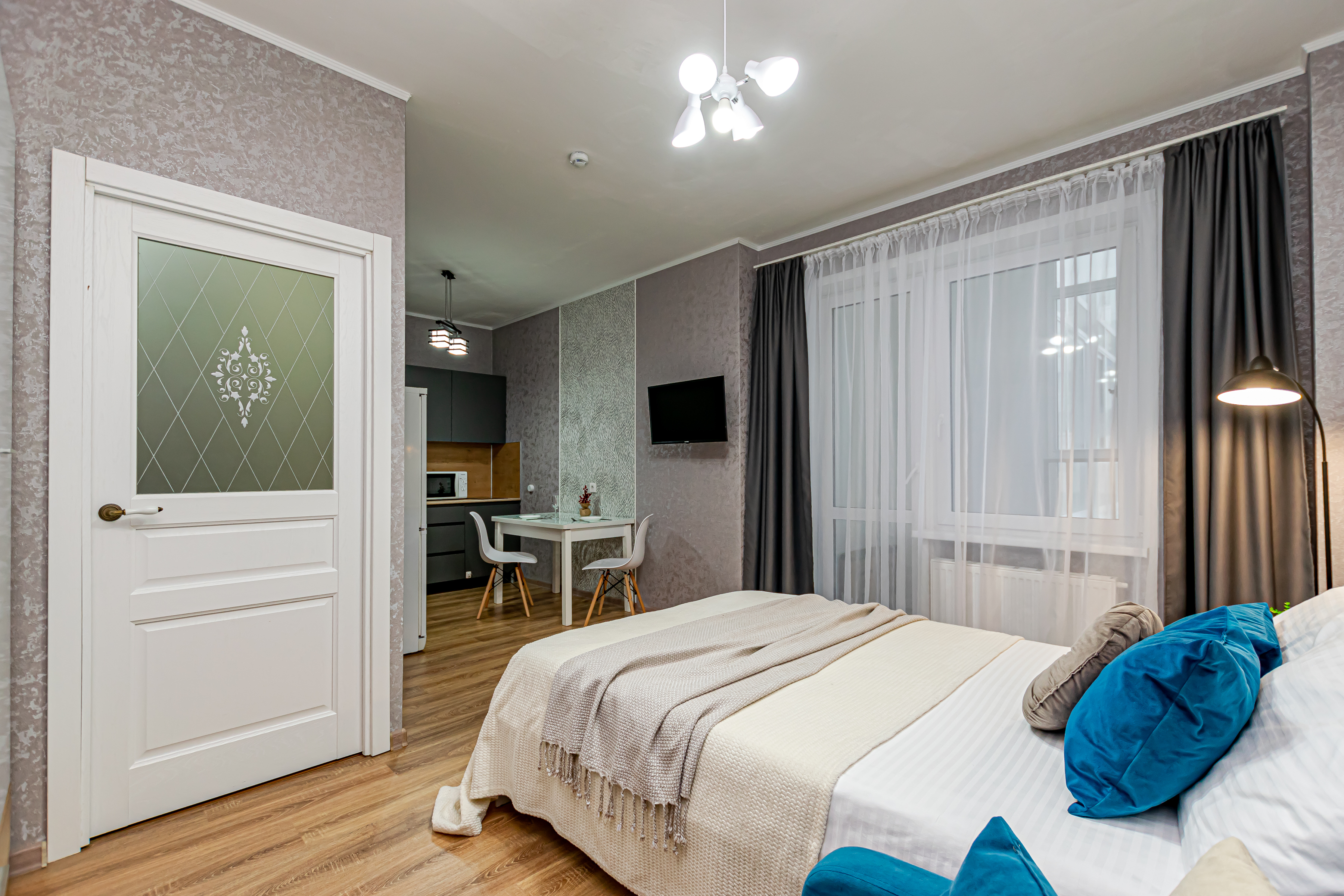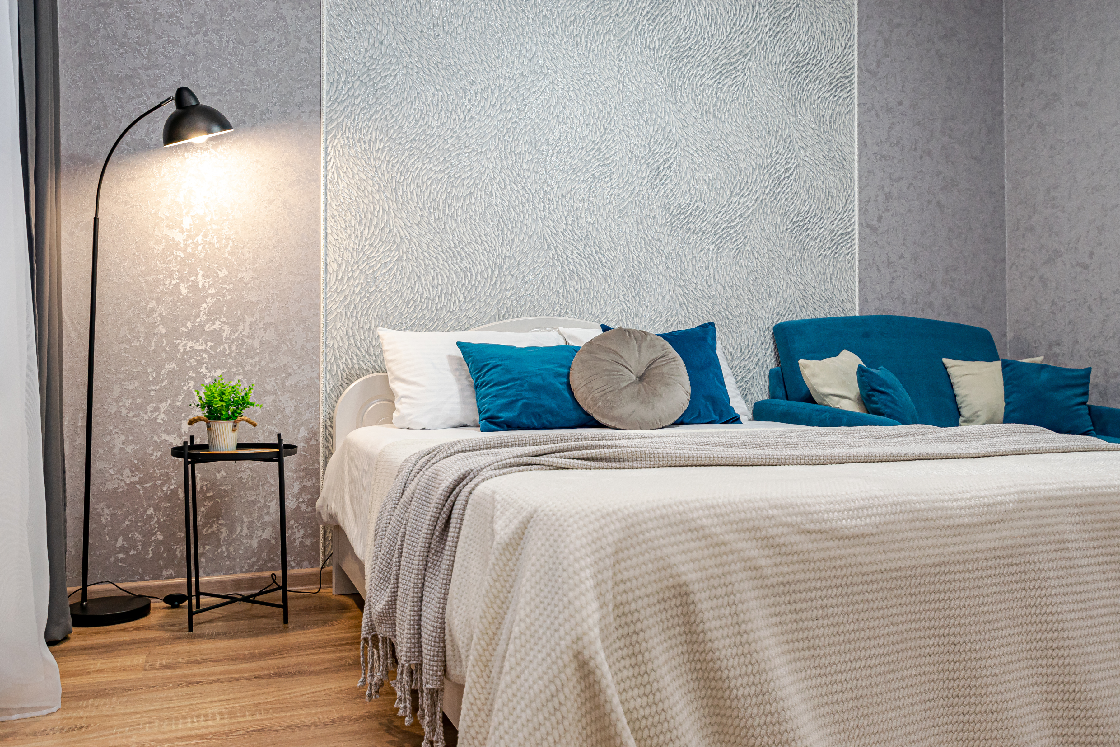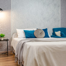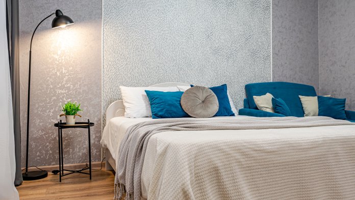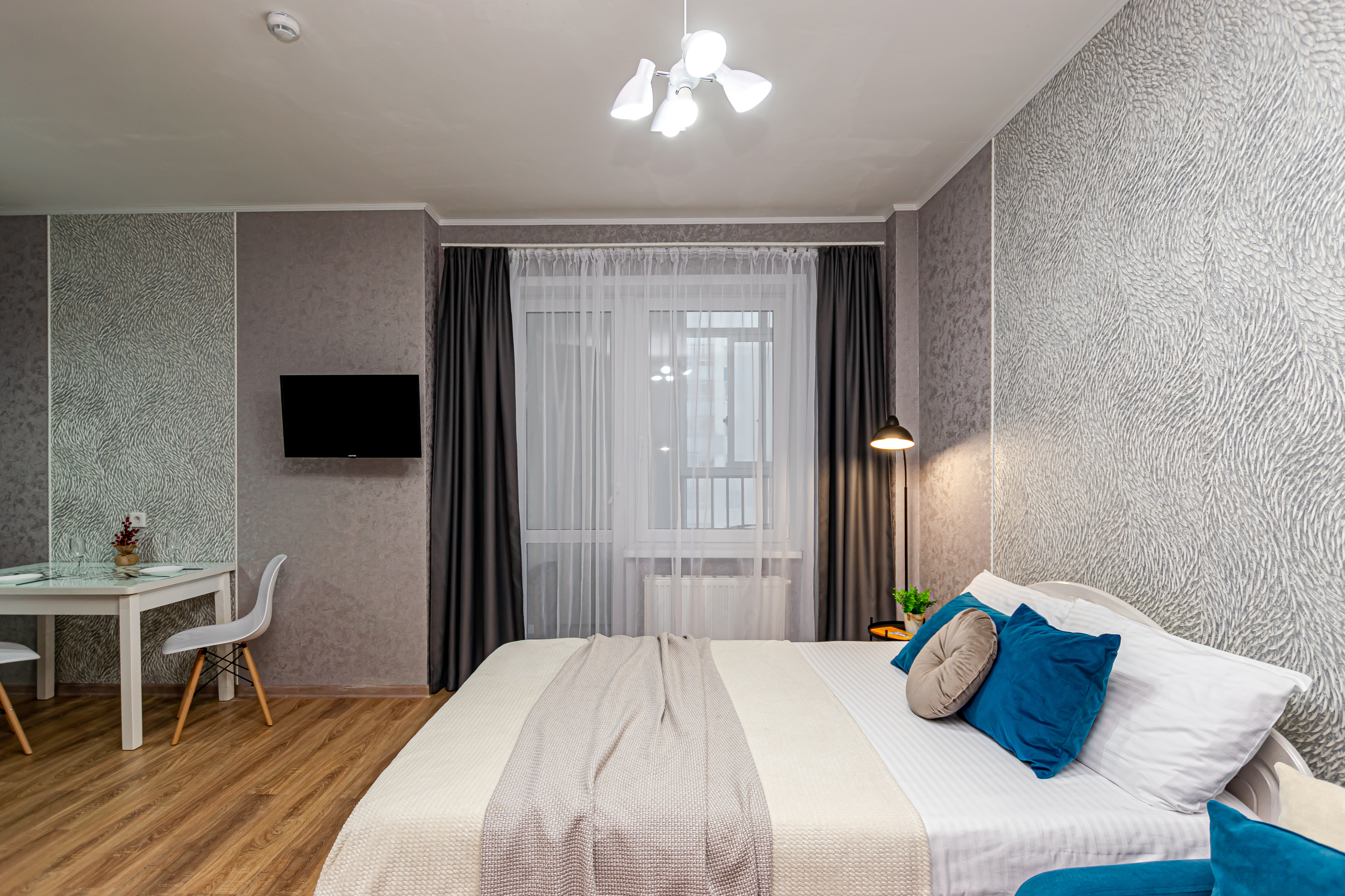 - Двуспальная кровать с ортопедическим матрасом и нежным постельным бельём из сатина.