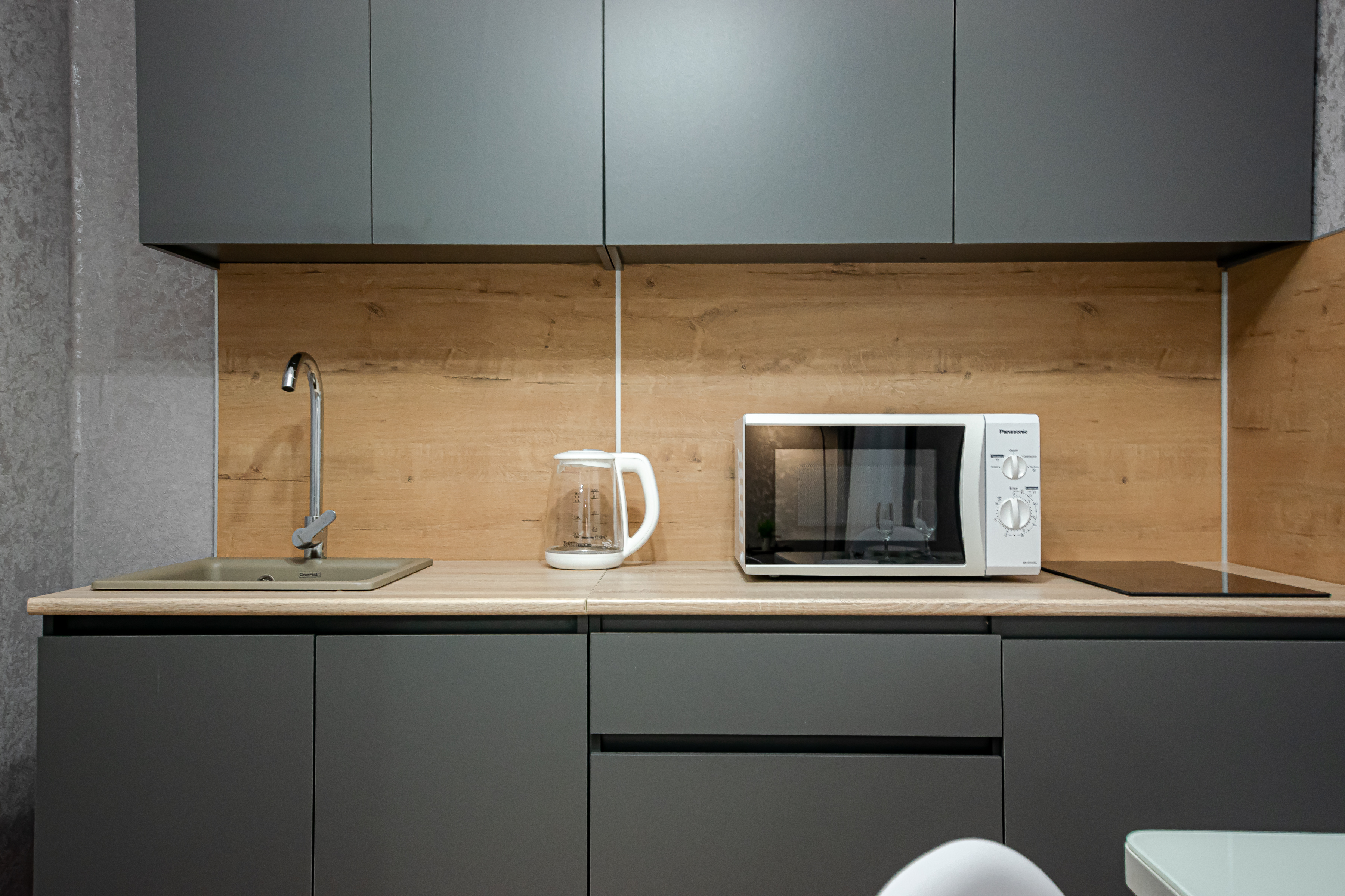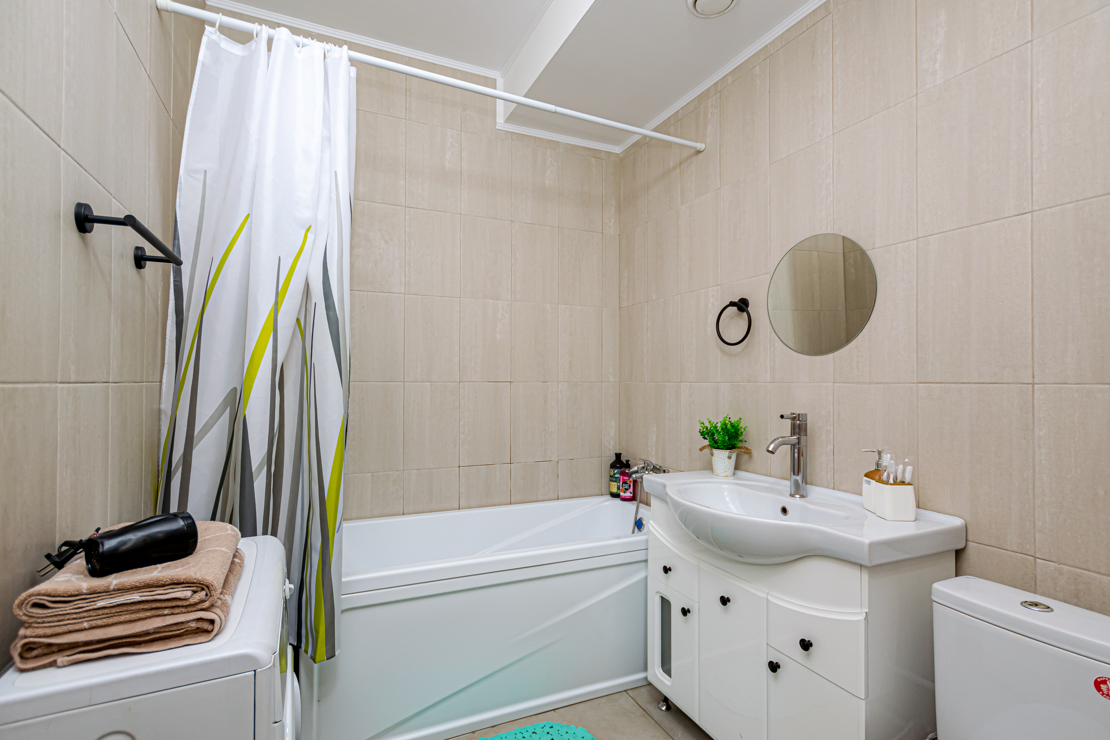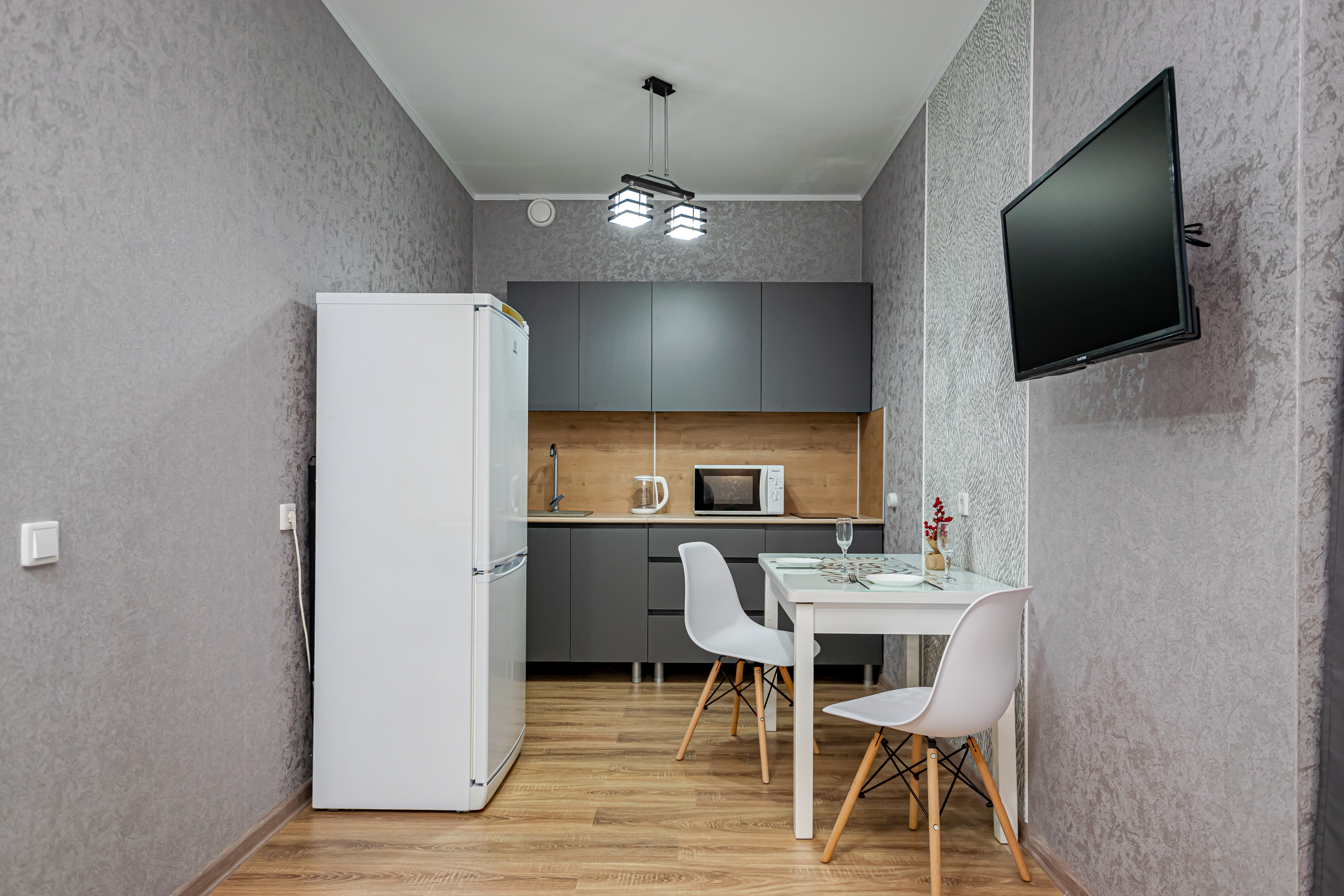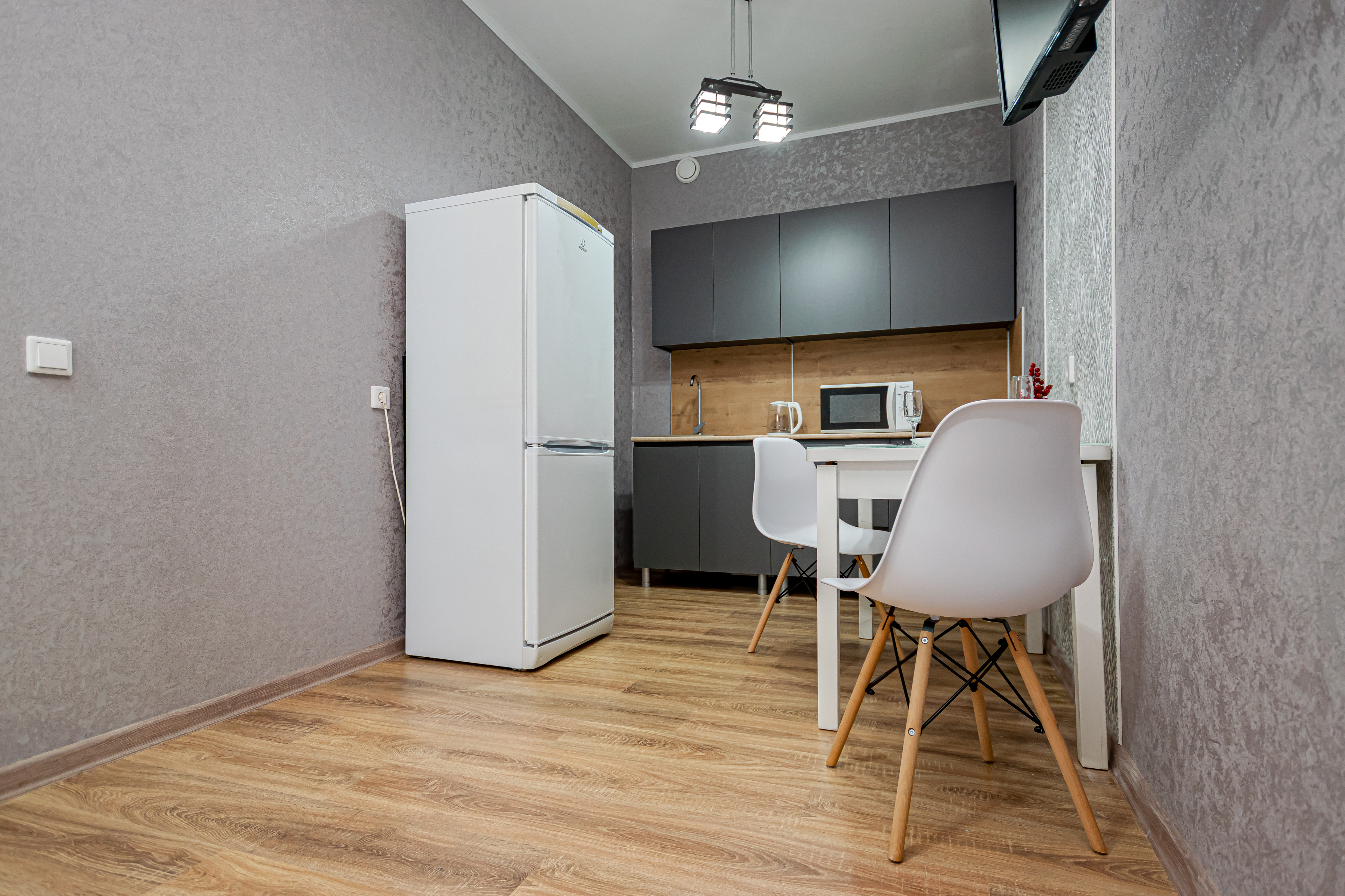 - Полный набор техники: холодильник, стиралка, фен, утюг, чайник, микроволновка.