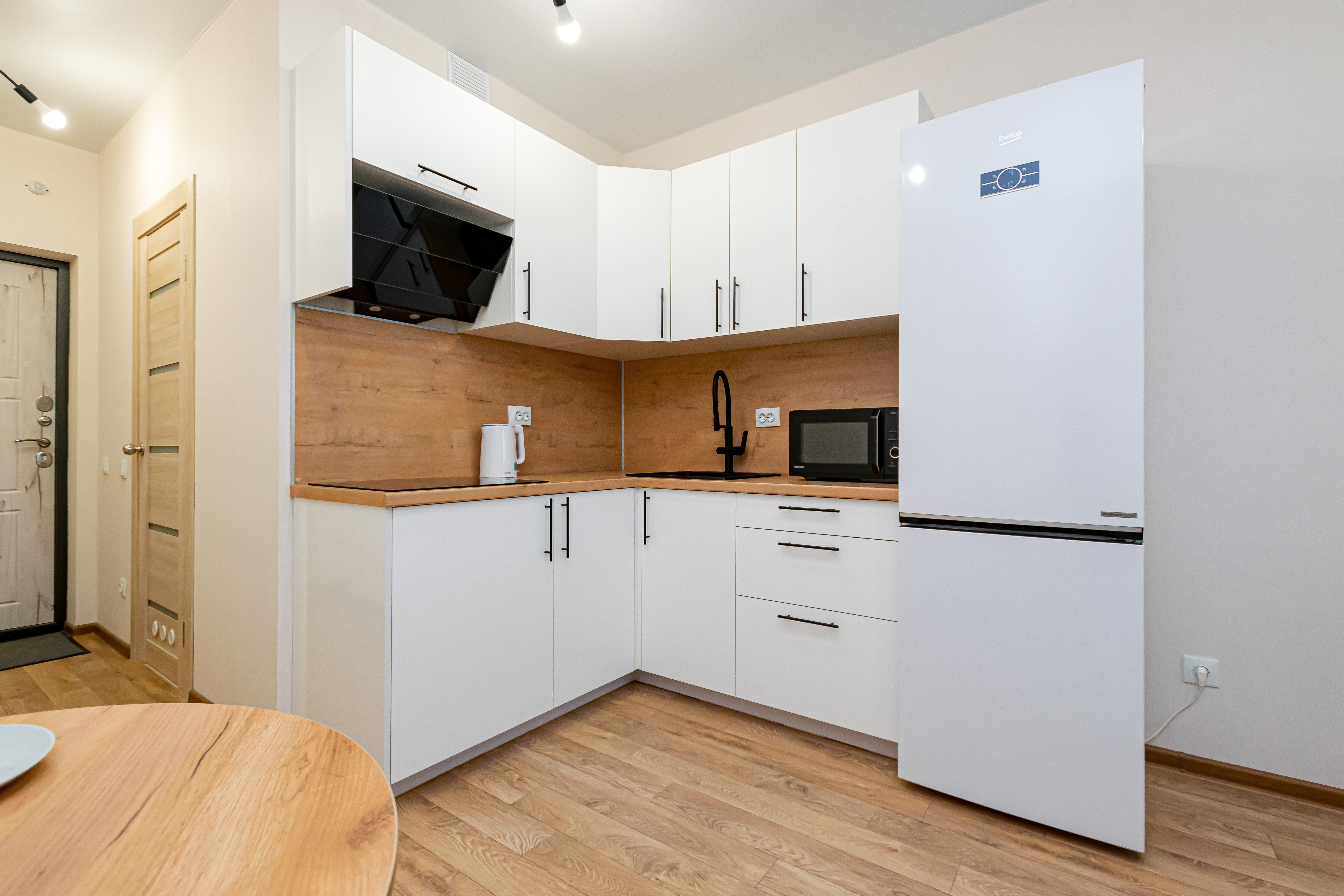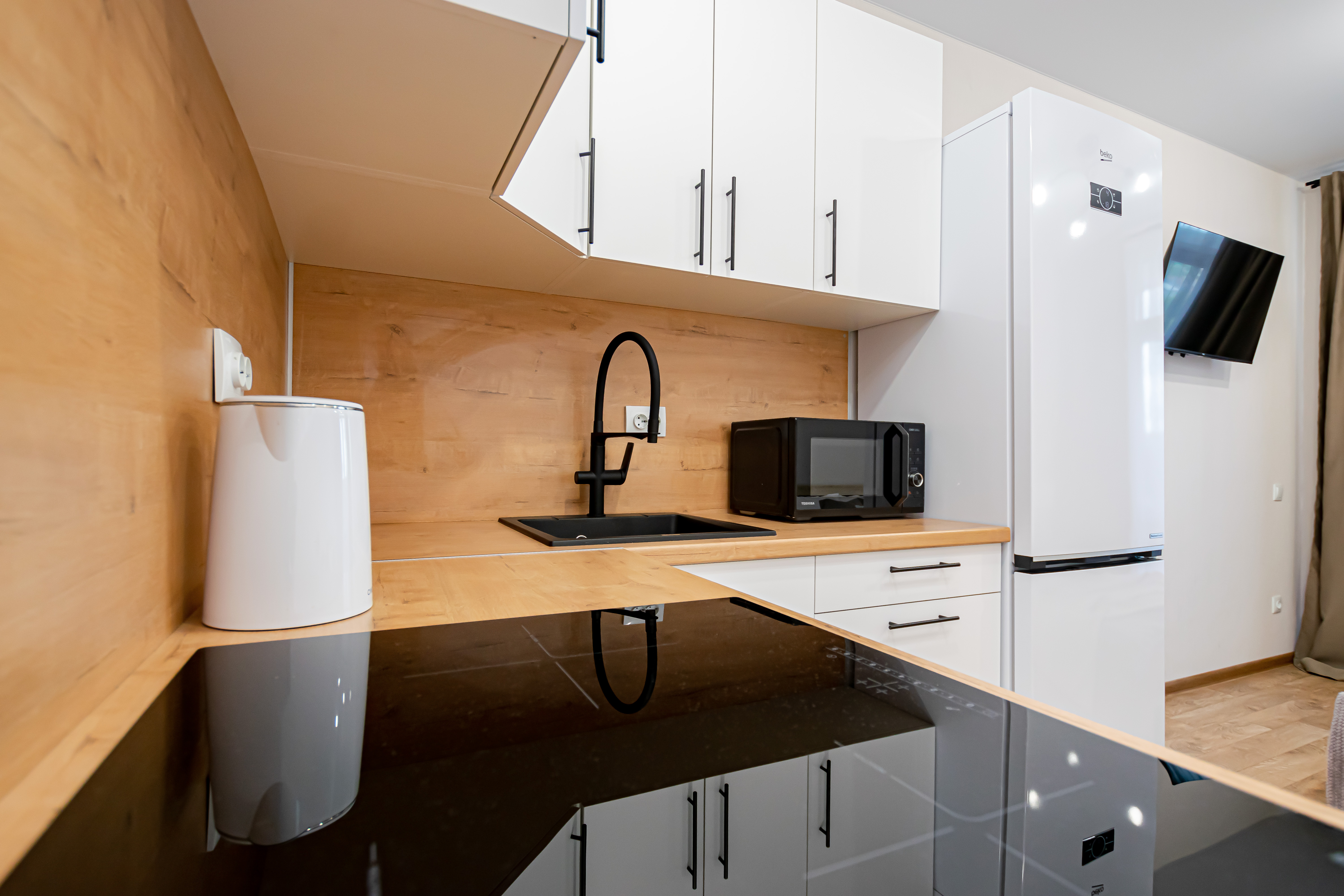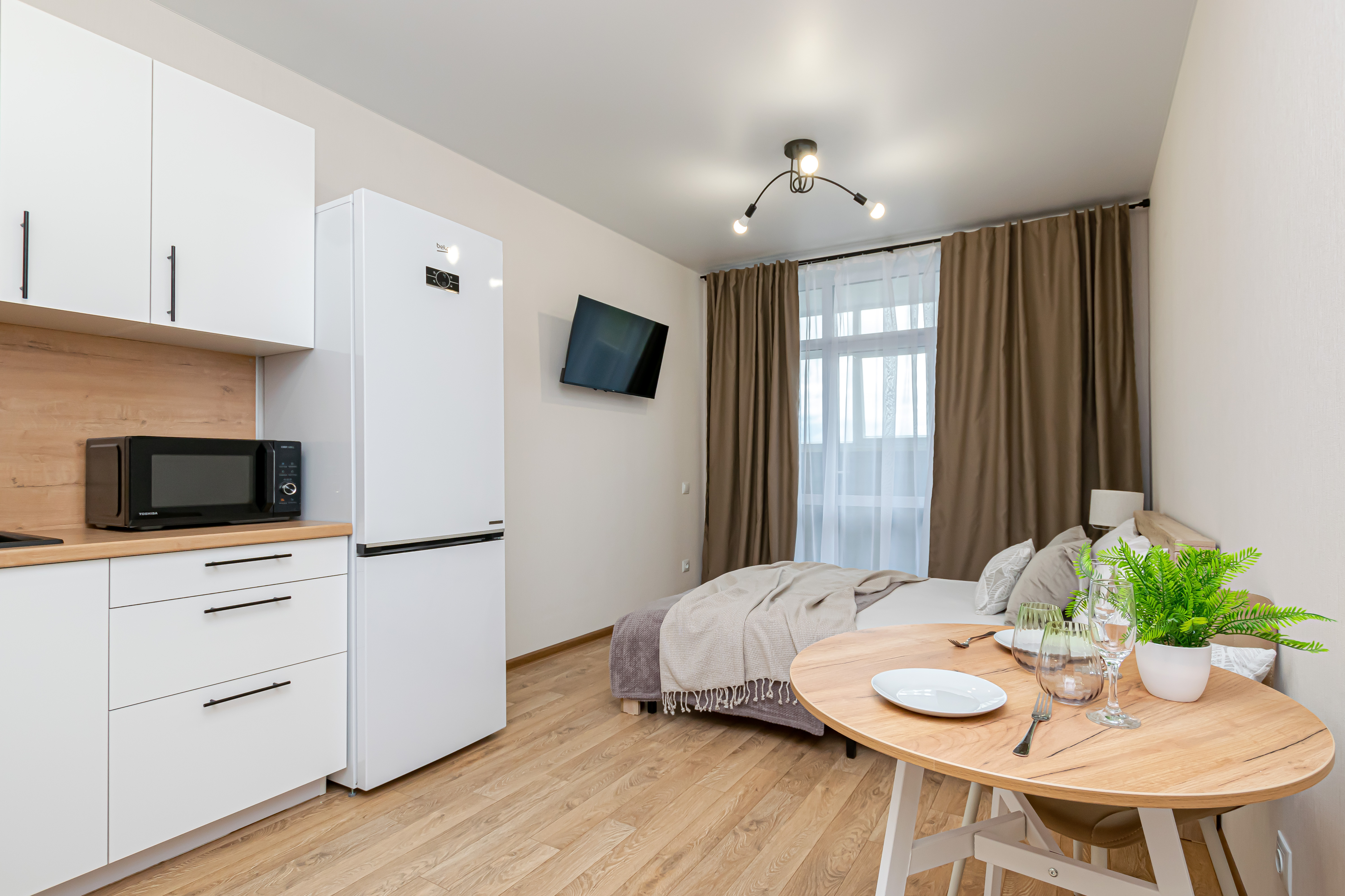 - Полный набор техники: холодильник, телевизор с функцией Smart-TV, стиралка, фен, утюг, чайник, микроволновка.