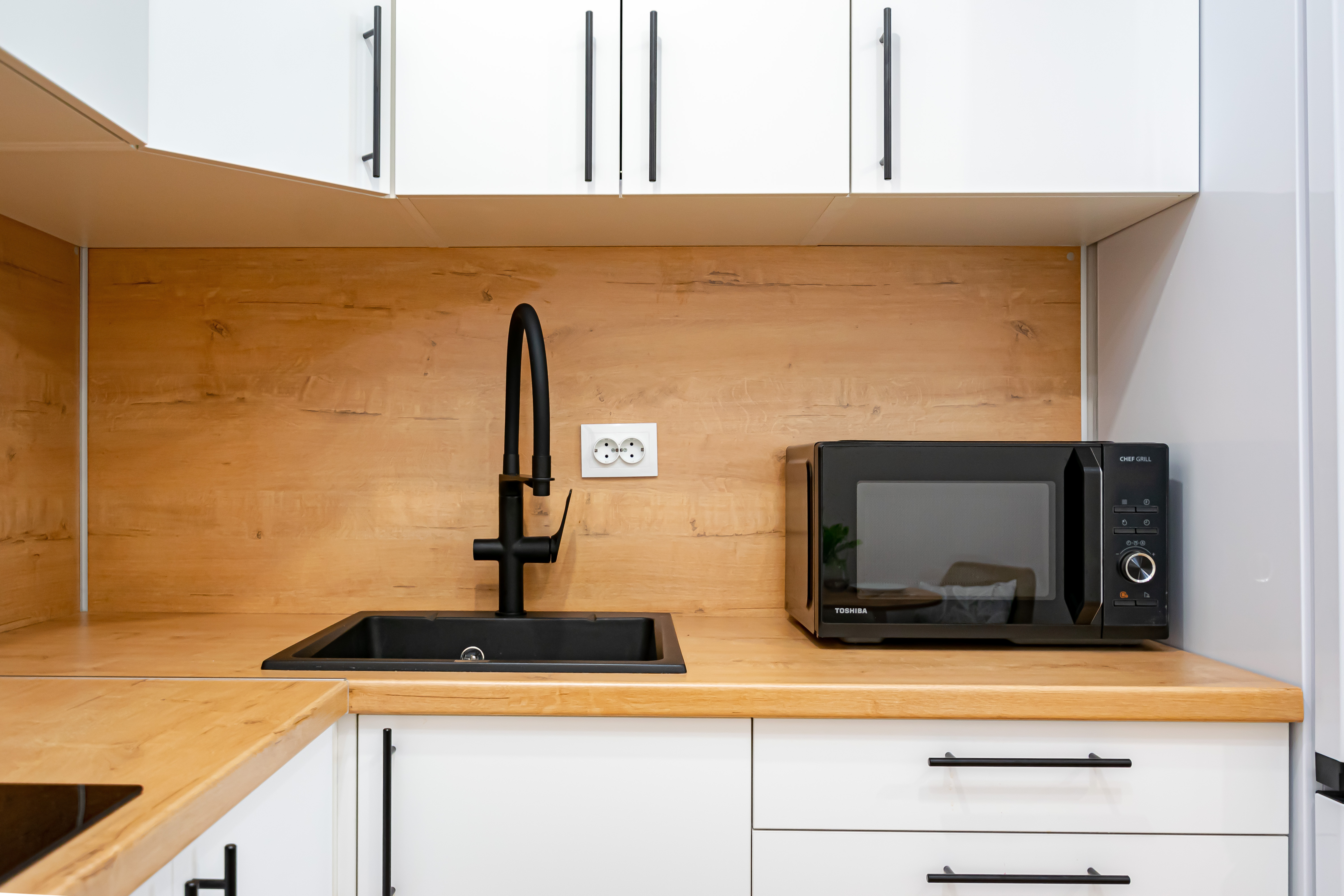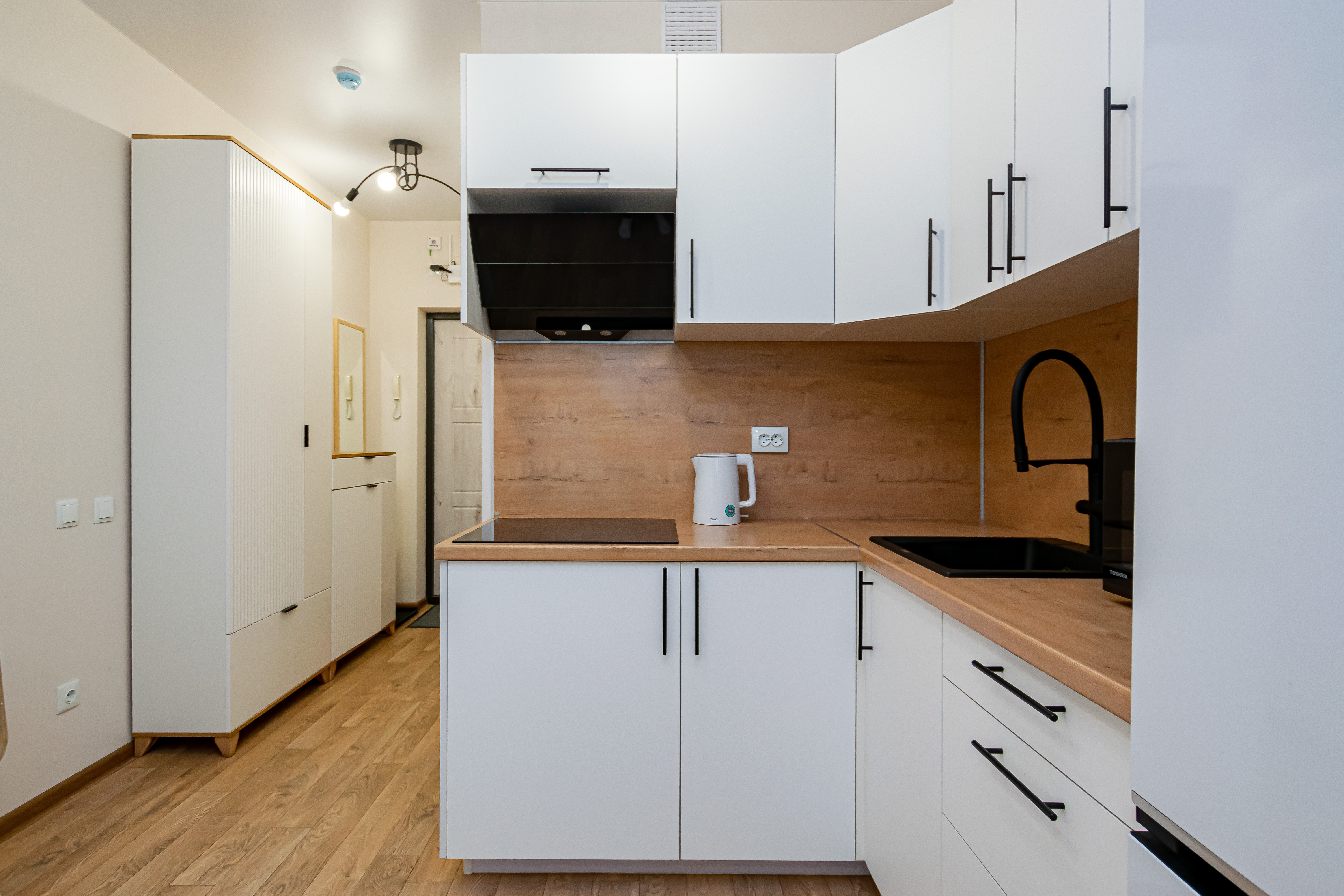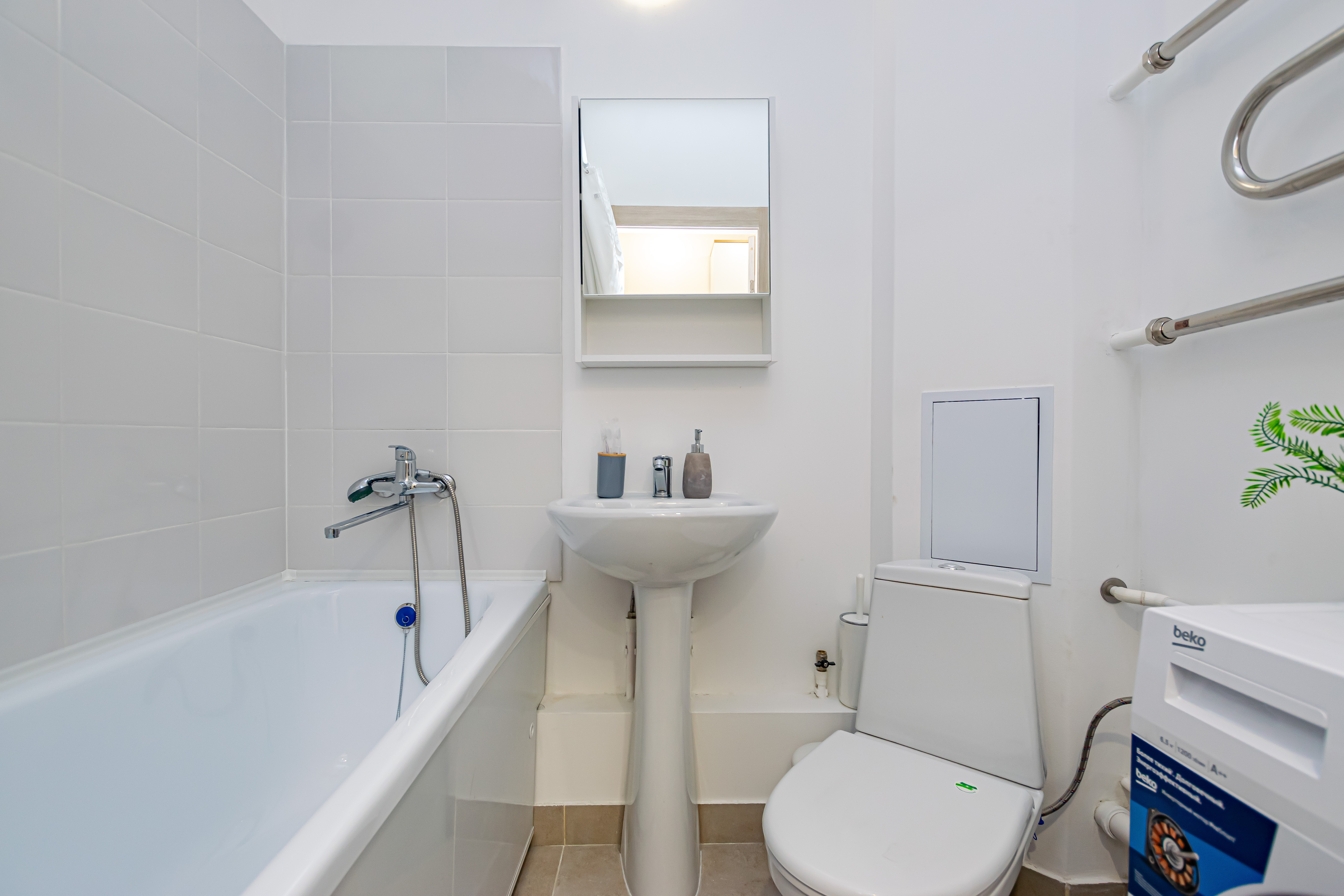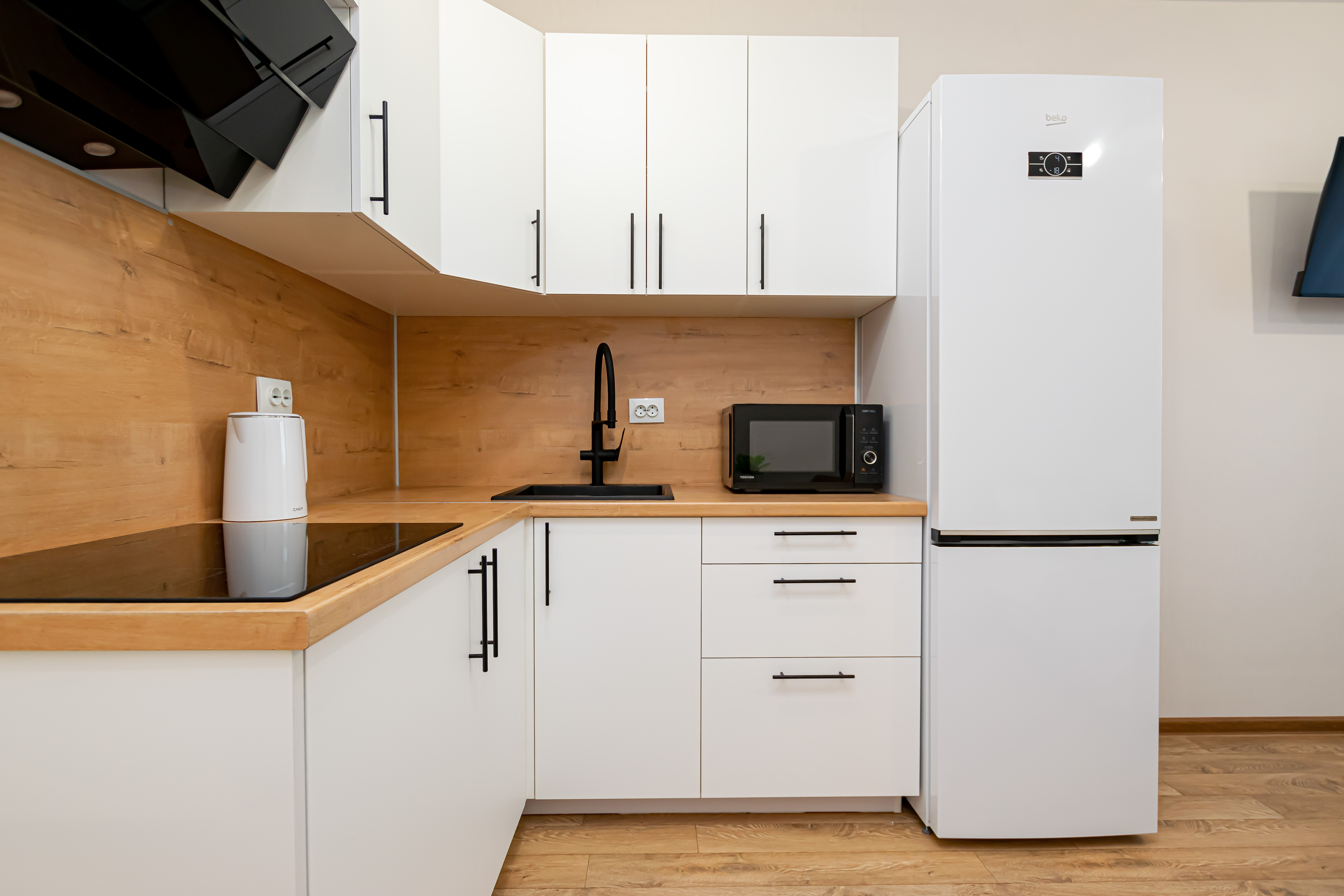 - Полный набор техники: холодильник, телевизор с функцией Smart-TV, стиралка, фен, утюг, чайник, микроволновка.