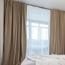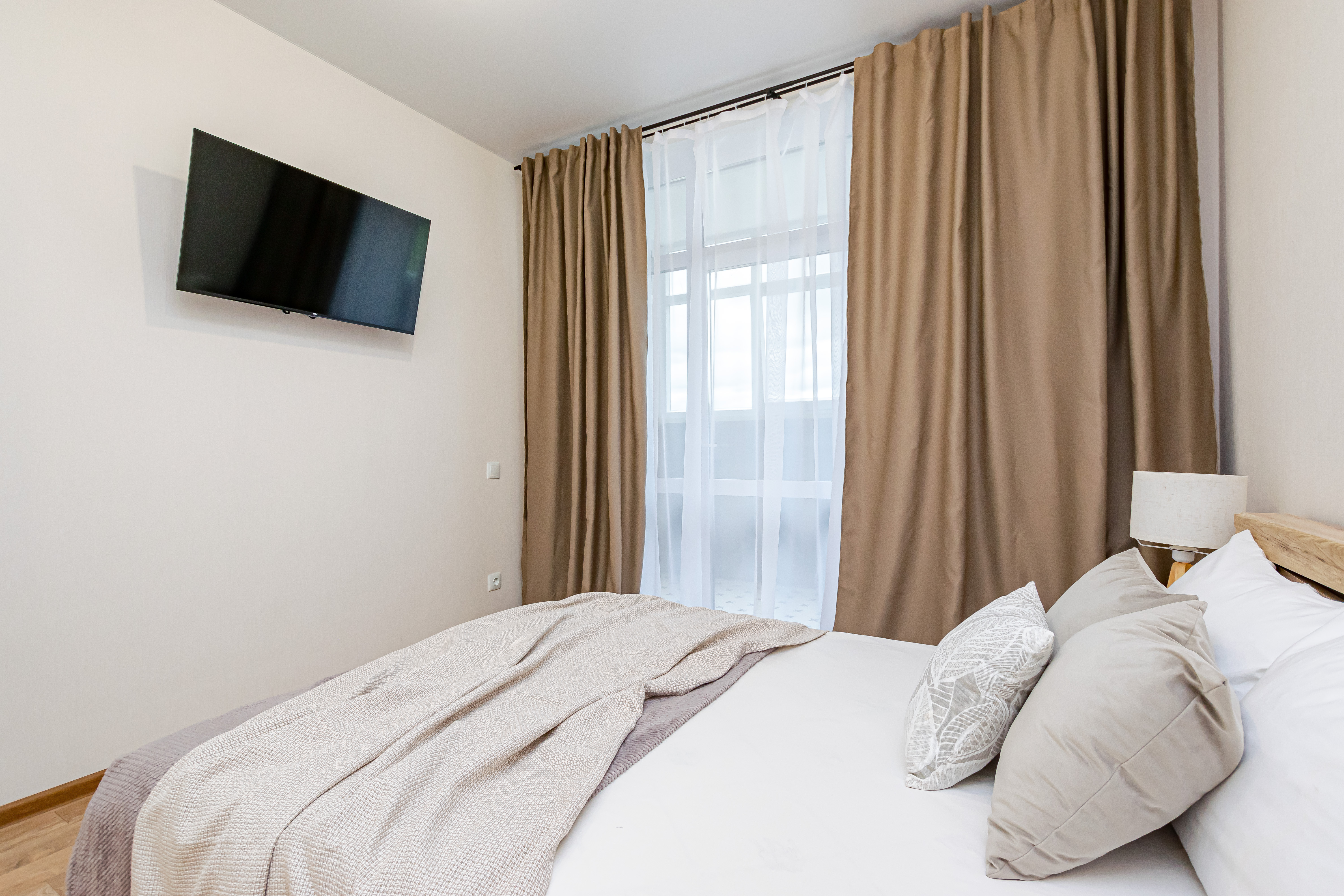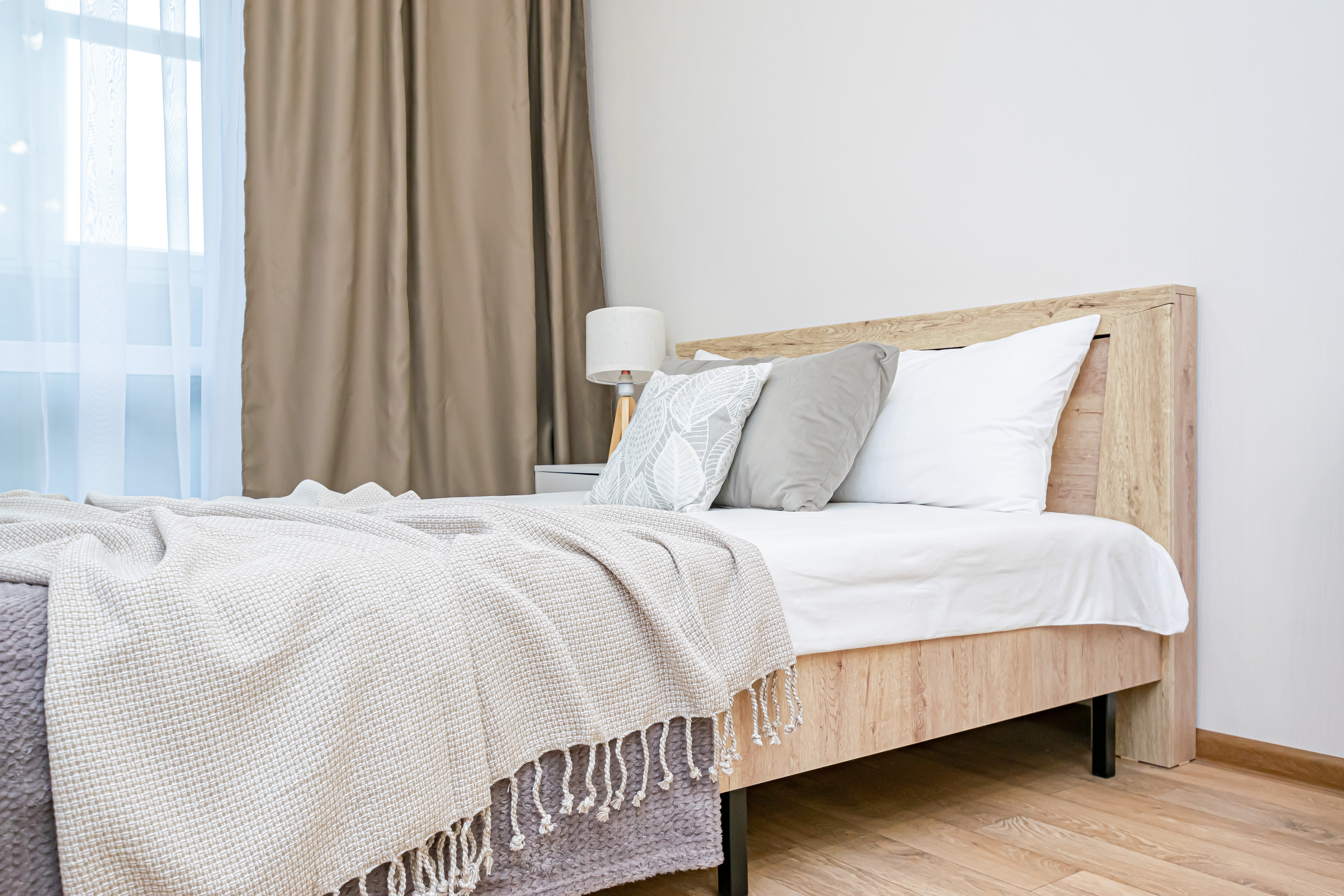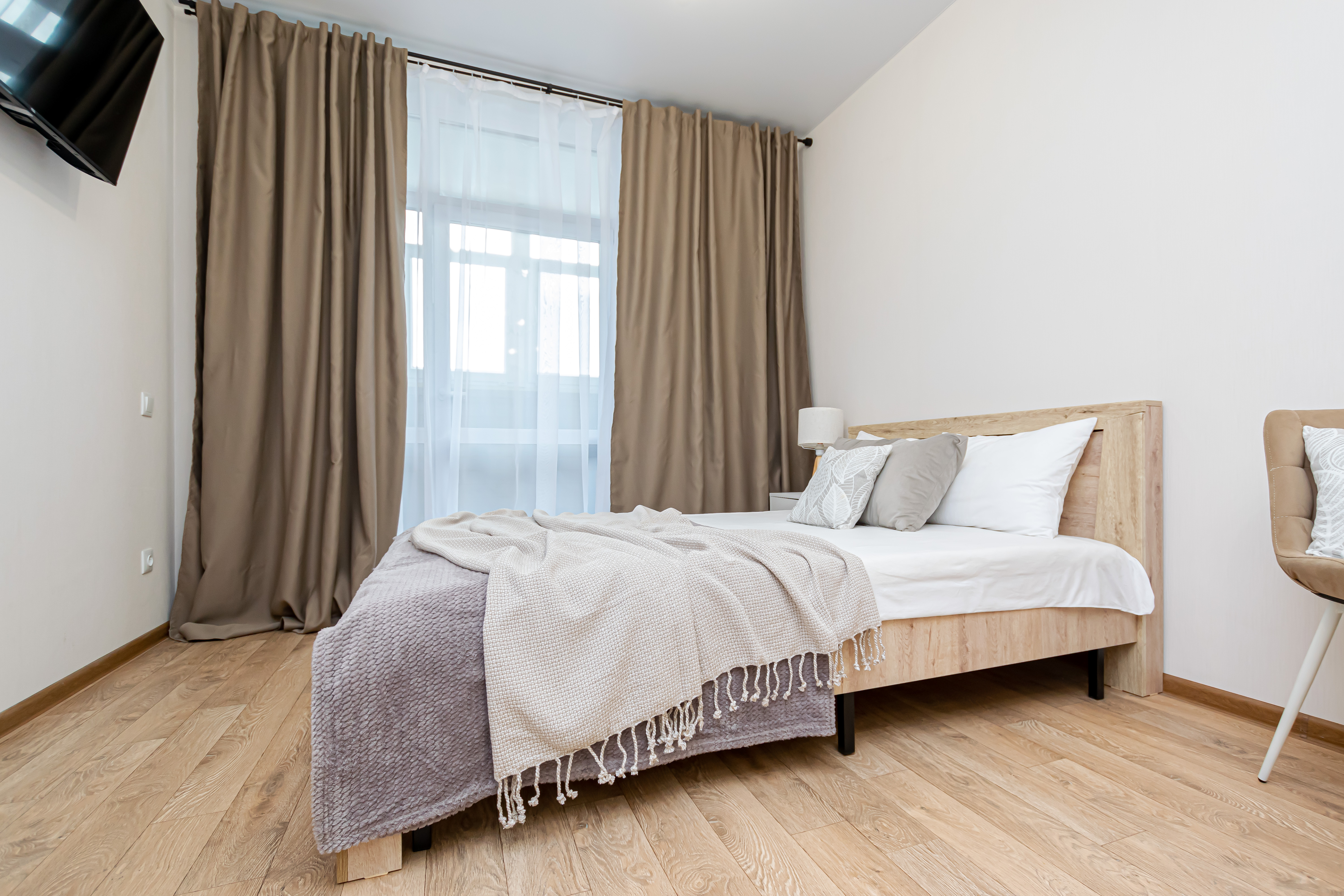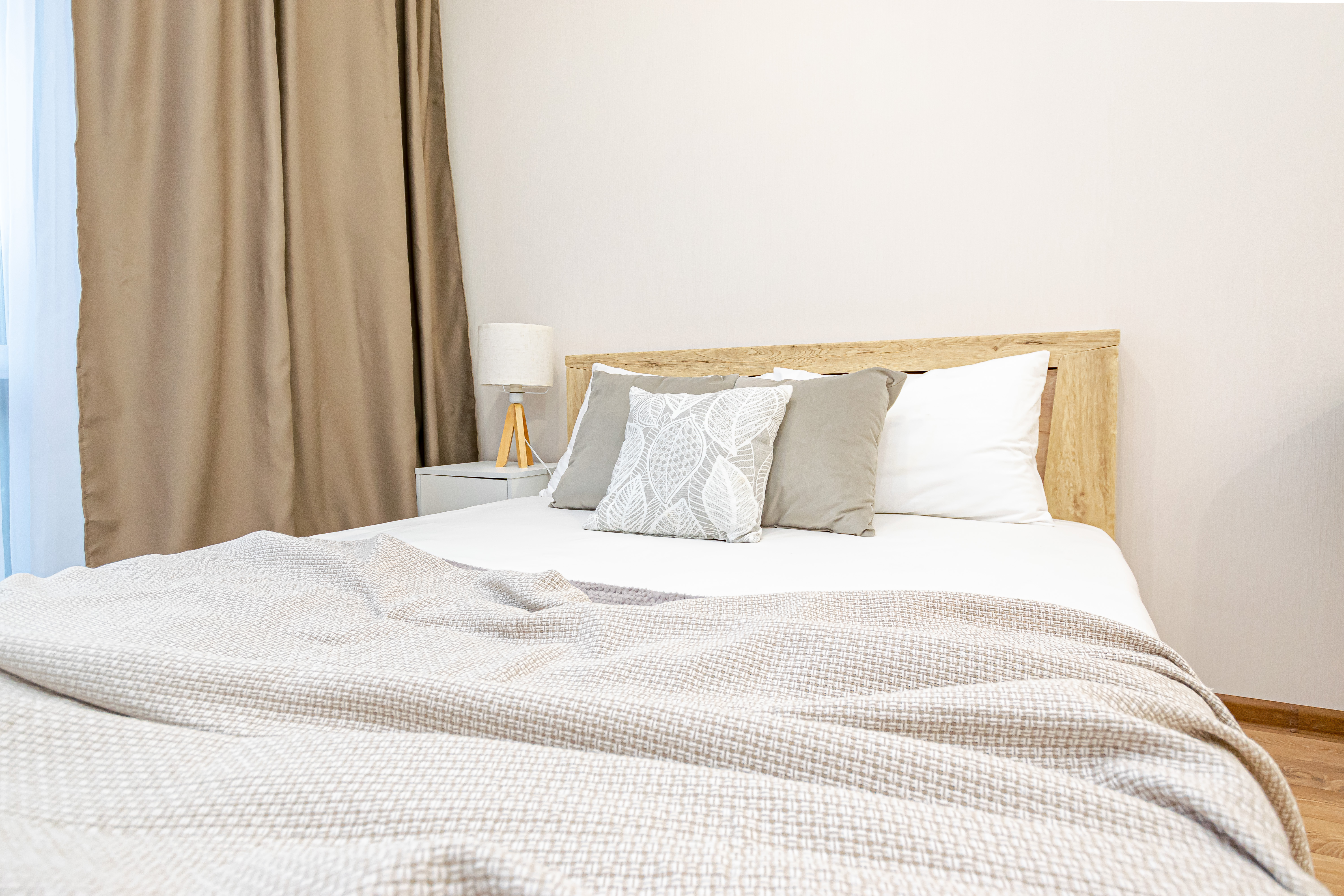 - Двуспальная кровать с ортопедическим матрасом и нежным постельным бельём из сатина.