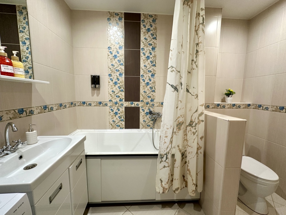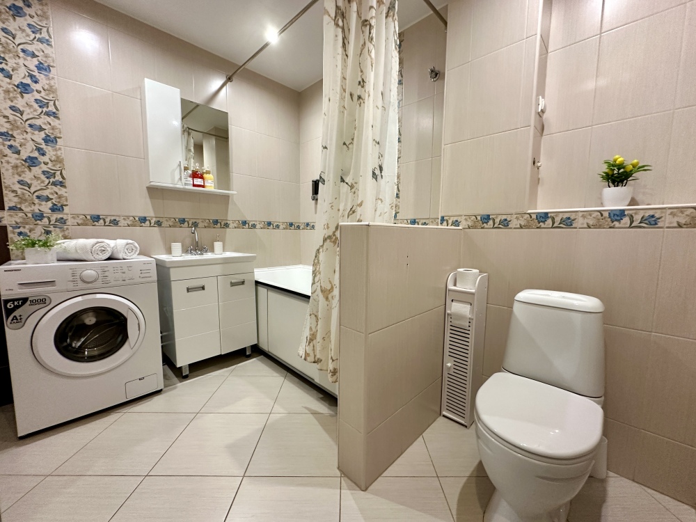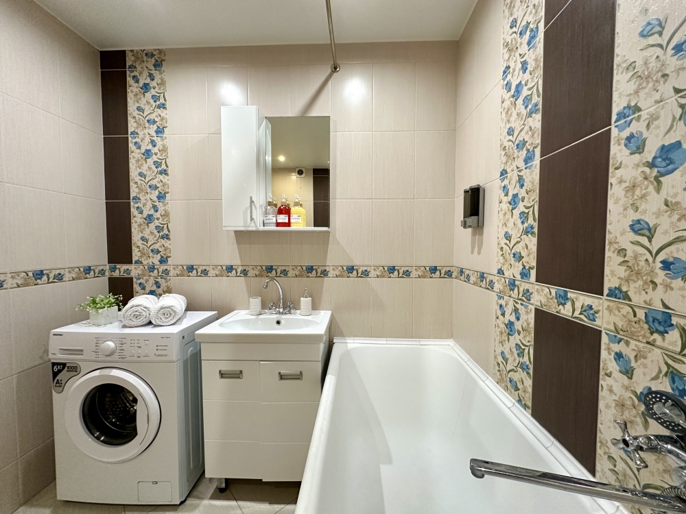 - Современная бытовая техника: варочная панель, двухкамерный холодильник, электрочайник, СВЧ, фен, утюг, стиральная машина.