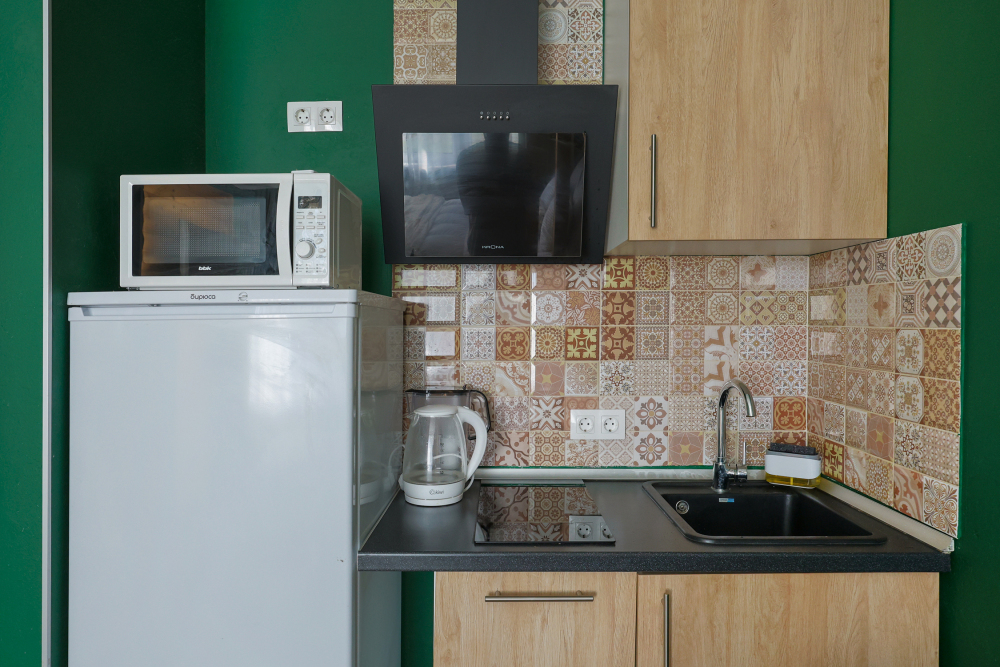— плита, вытяжка, микроволновка, холодильник, чайник;