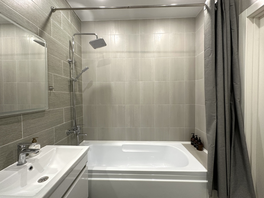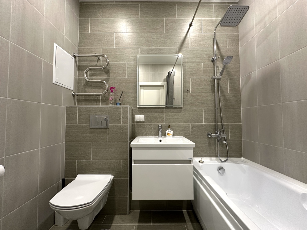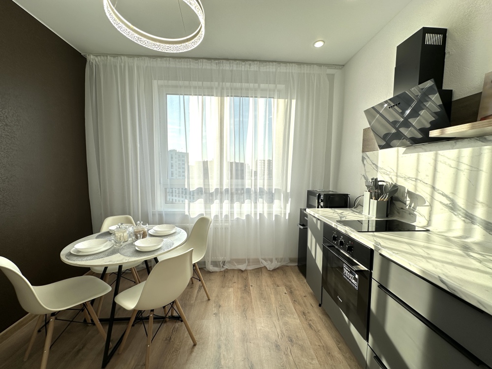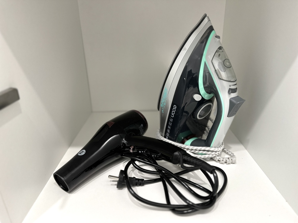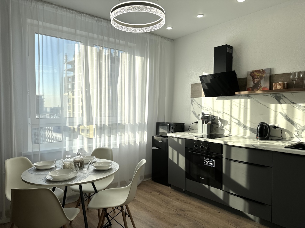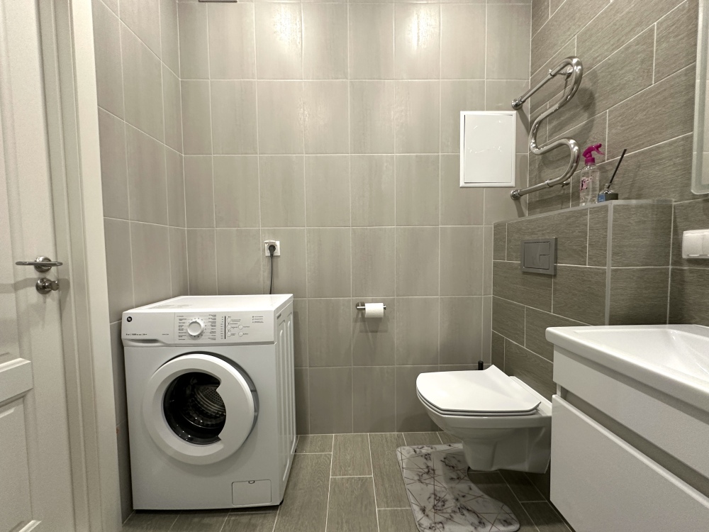- Современная бытовая техника: варочная панель, духовой шкаф, вытяжка, двухкамерный холодильник, электрочайник, СВЧ, фен, утюг, стиральная машина.