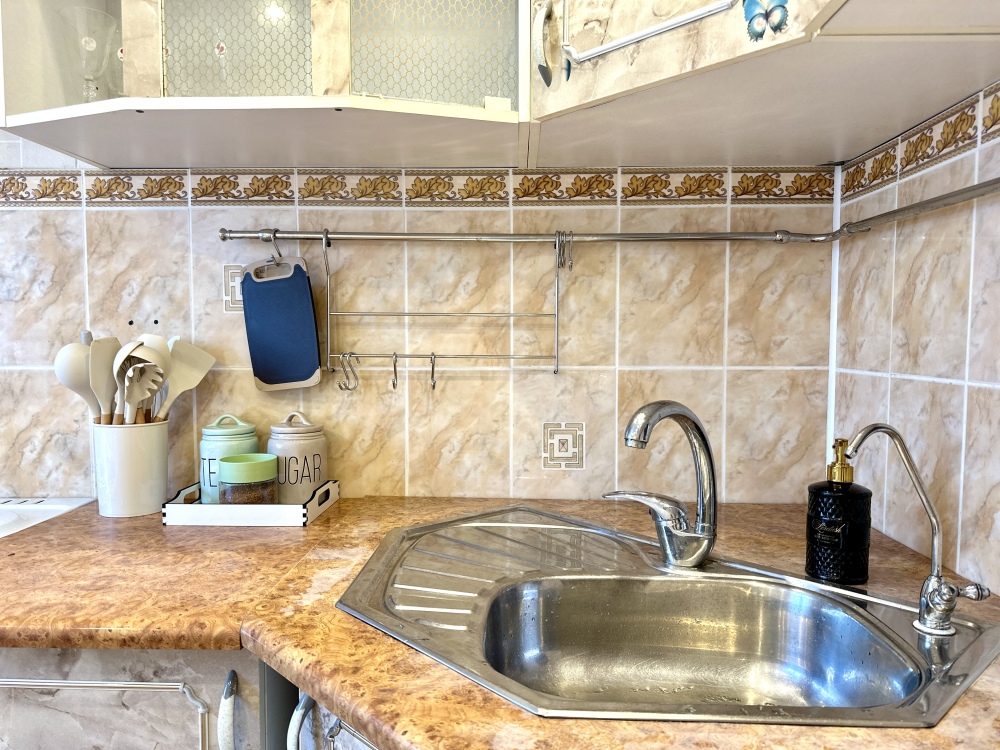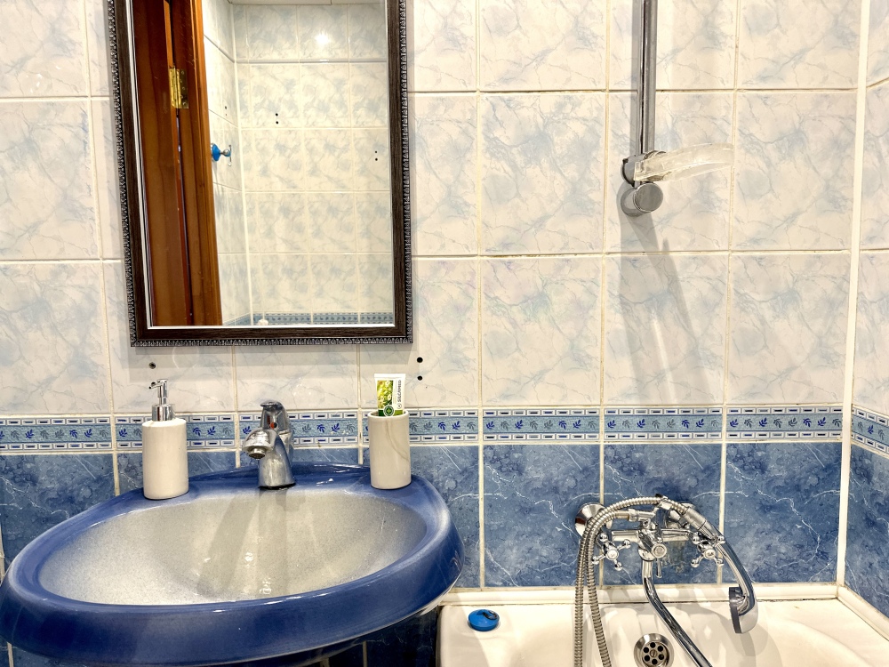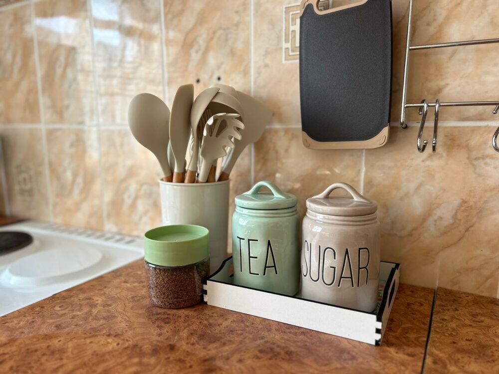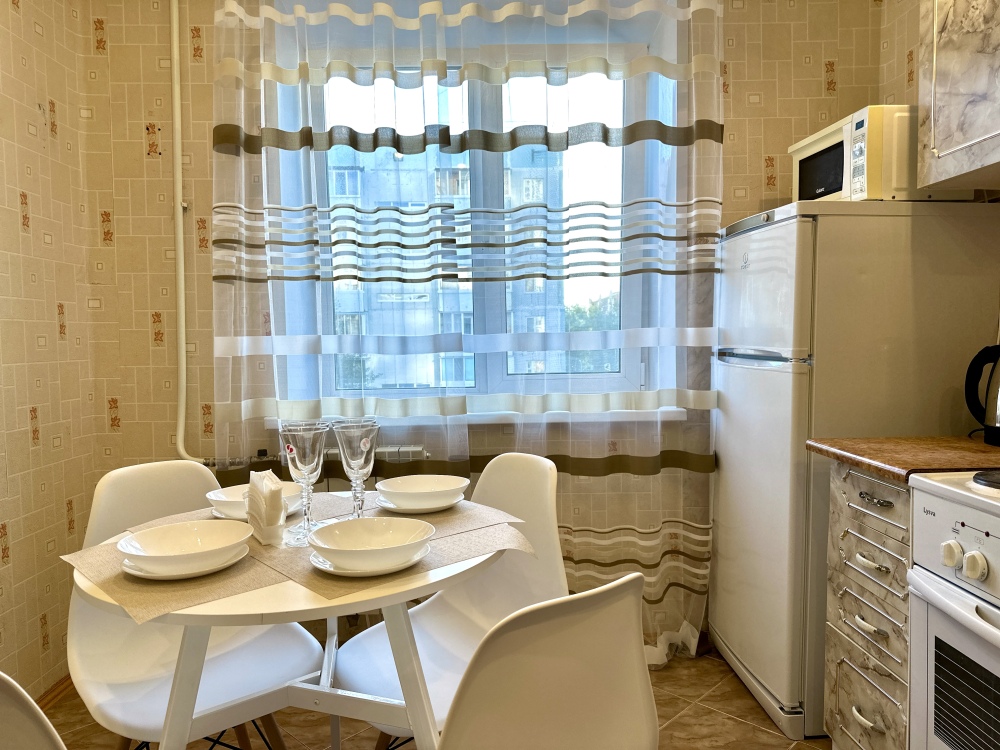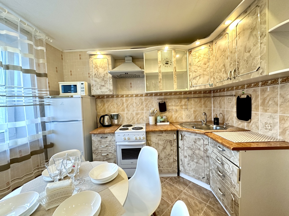 - Современная бытовая техника: электрическая плита, вытяжка, двухкамерный холодильник, электрочайник, СВЧ, фен, утюг, стиральная машина.