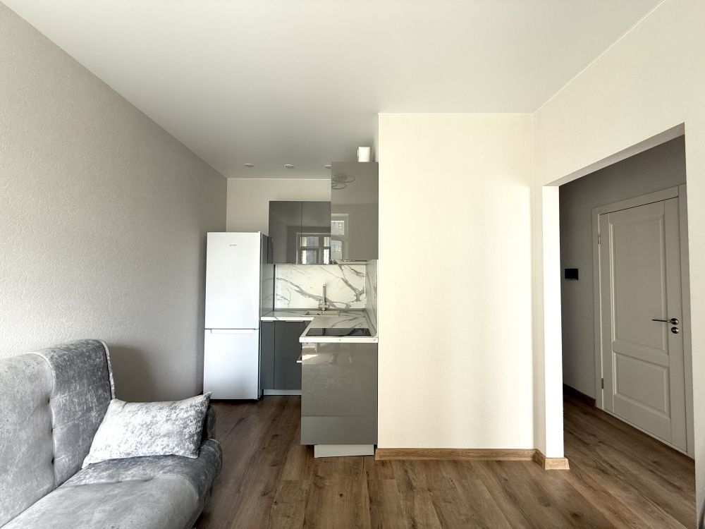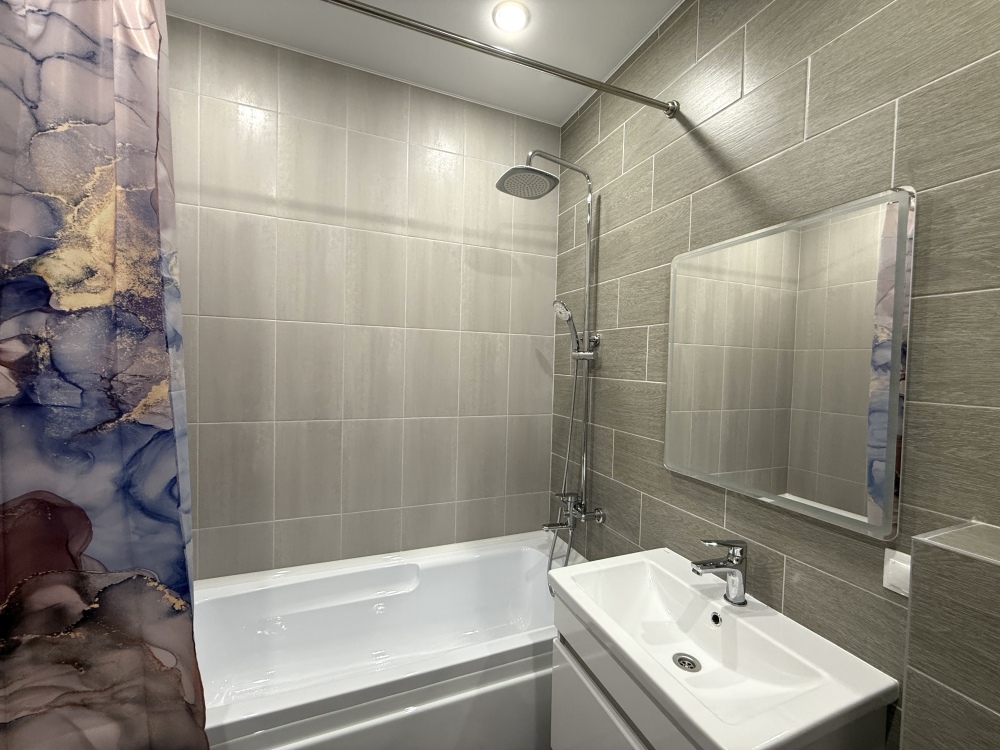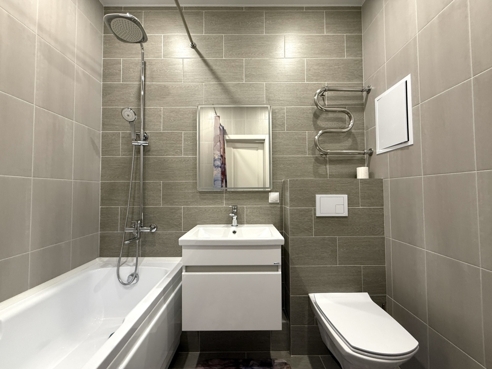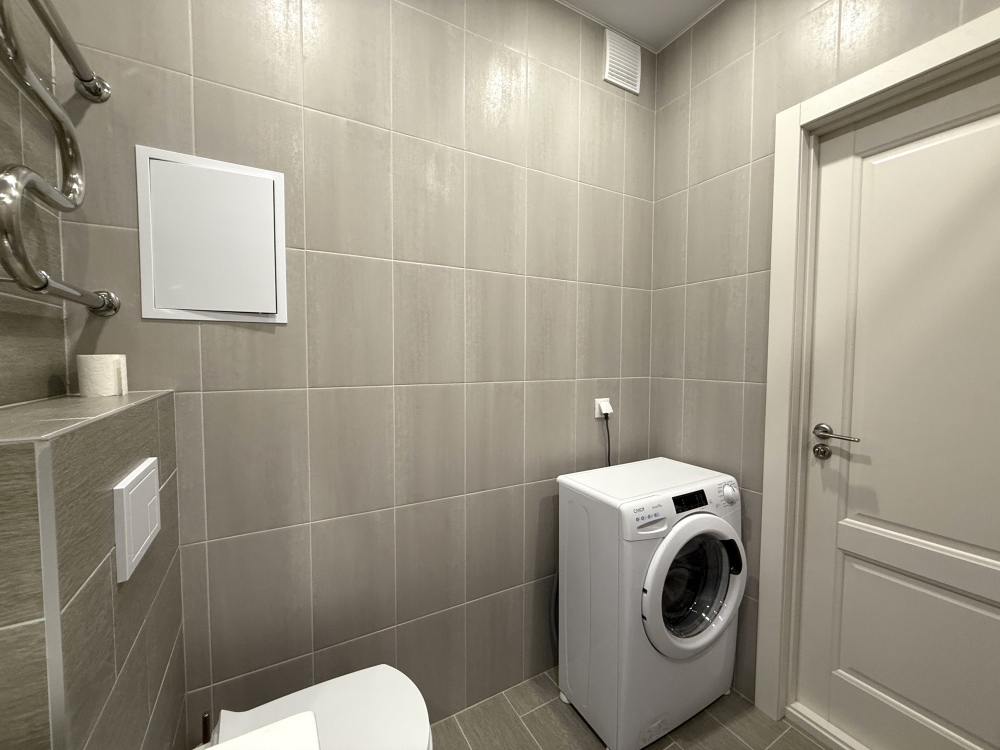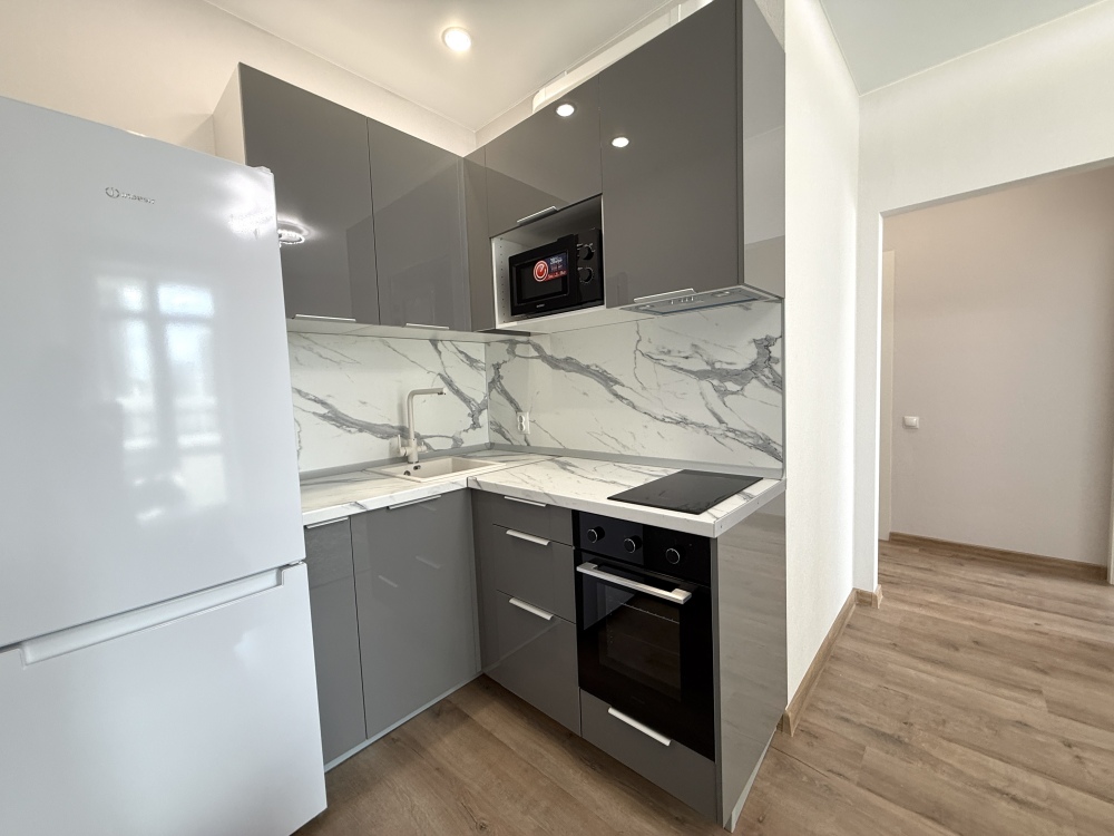- Современная бытовая техника: варочная панель, вытяжка, двухкамерный холодильник, электрочайник, СВЧ, фен, утюг, стиральная машина.