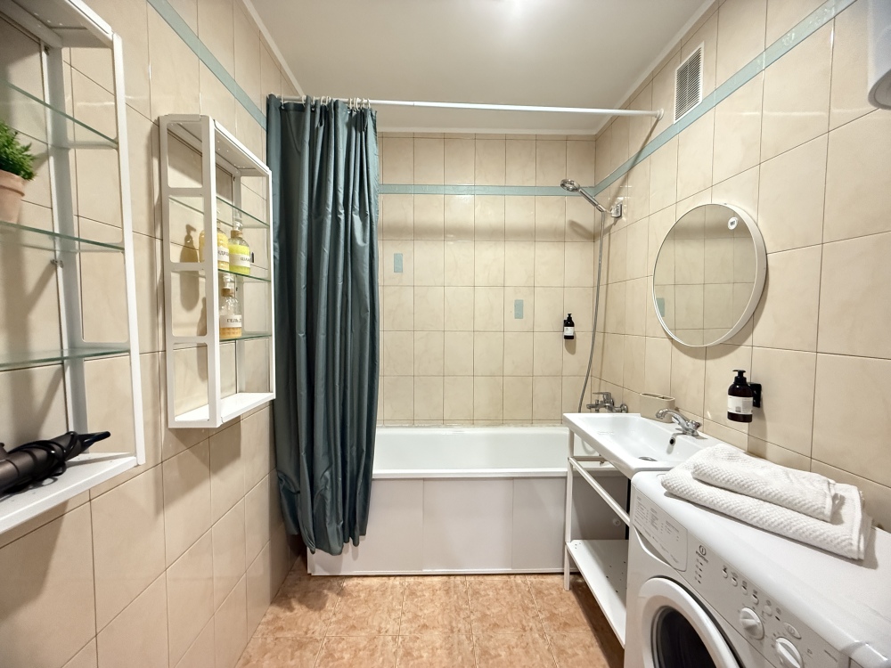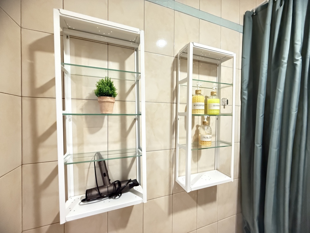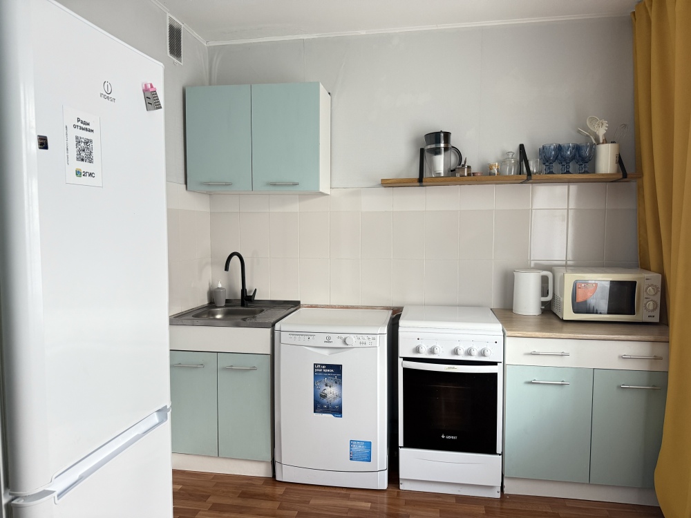 - Современная бытовая техника: электрическая плита, двухкамерный холодильник, электрочайник, СВЧ, фен, утюг, стиральная машина.