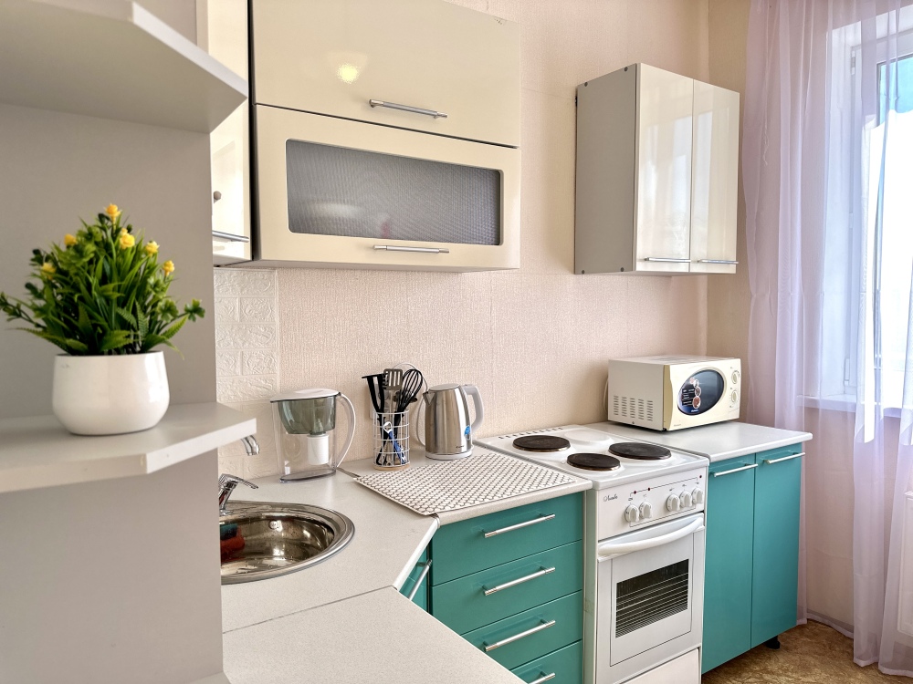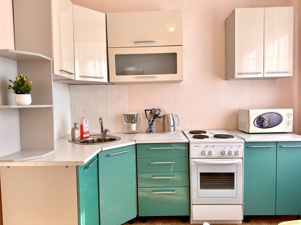 - Современная бытовая техника: электрическая плита, двухкамерный холодильник, электрочайник, СВЧ, фен, утюг, стиральная машина.