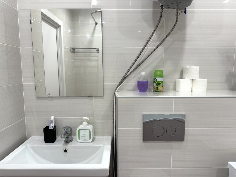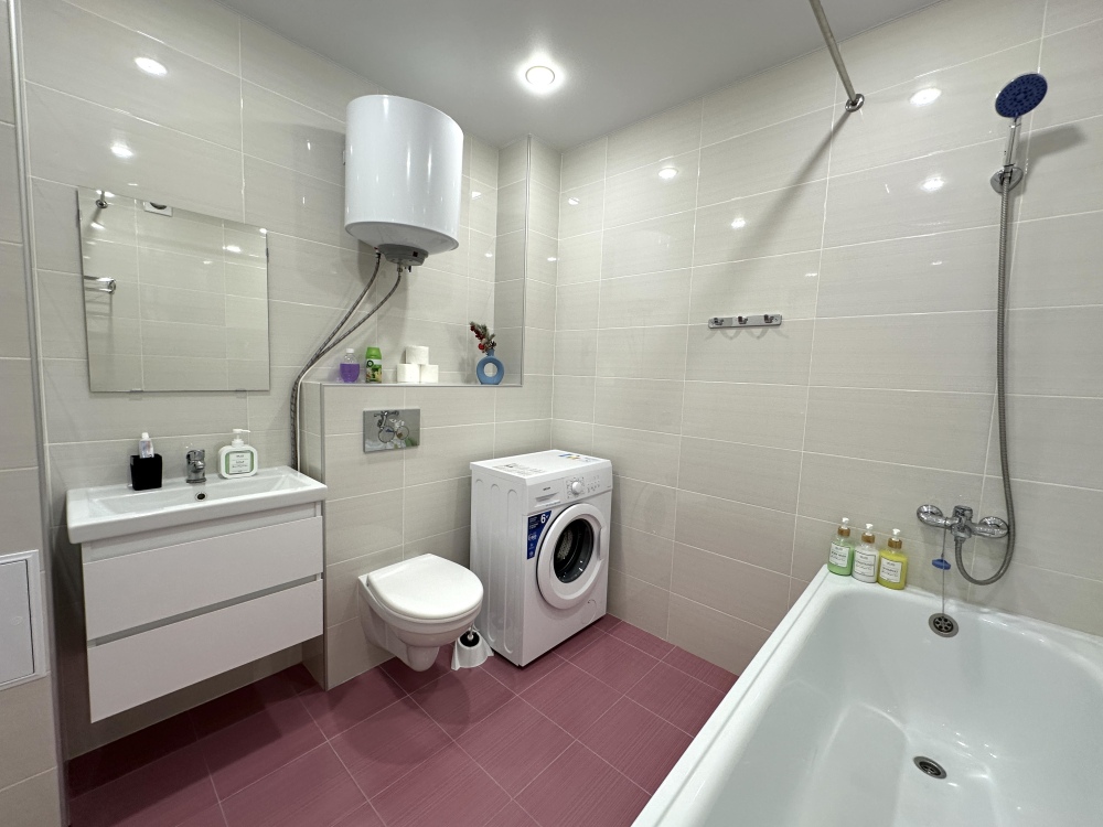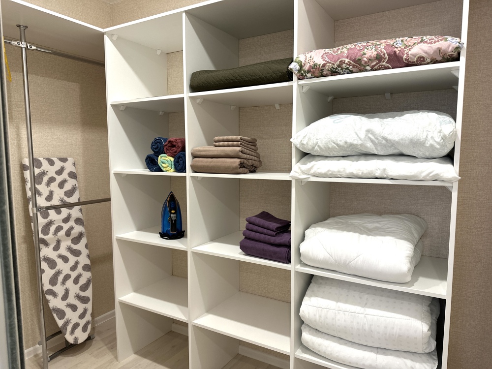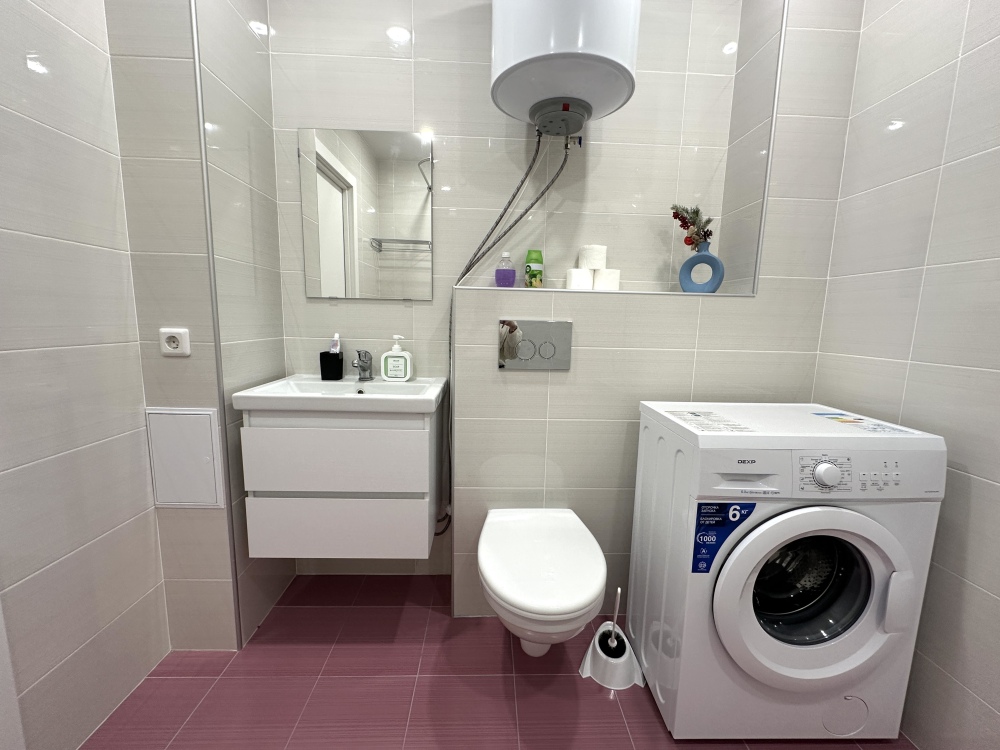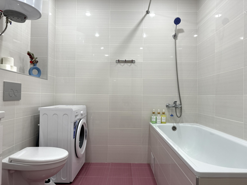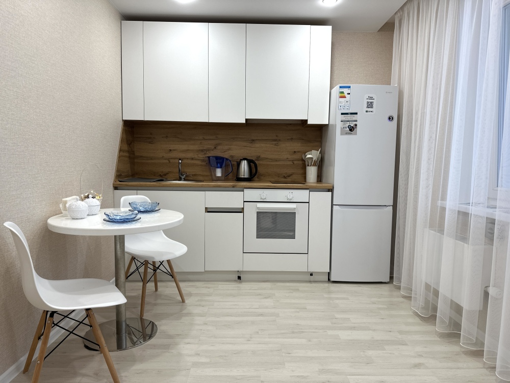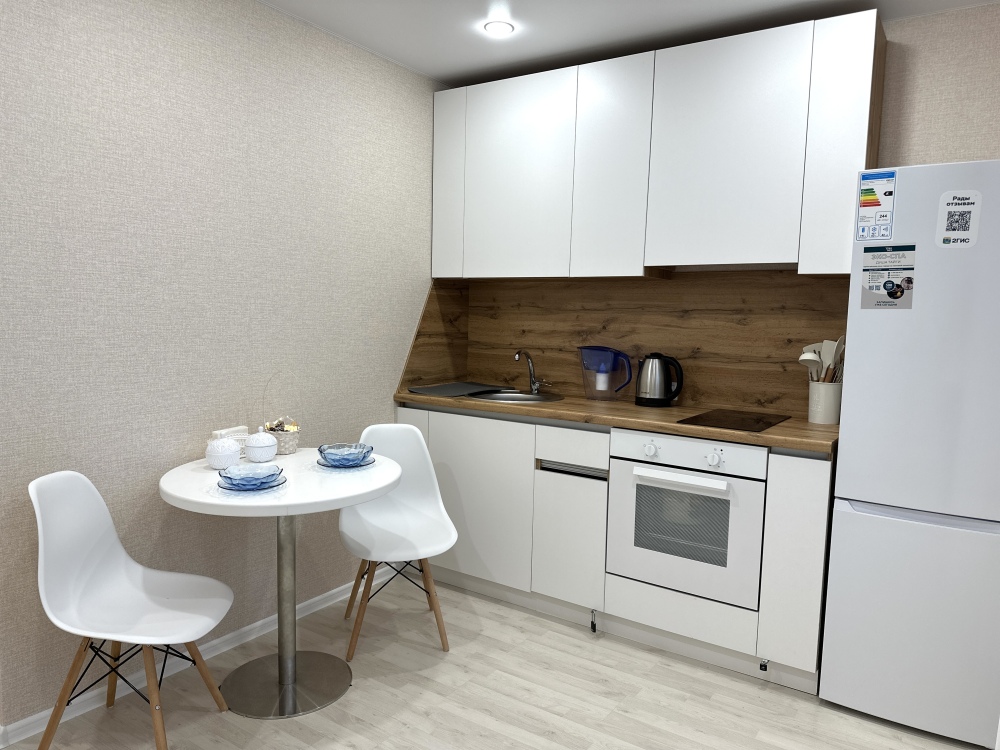 - Современная бытовая техника: варочная панель, духовой шкаф, двухкамерный холодильник, электрочайник, СВЧ, фен, утюг, стиральная машина.