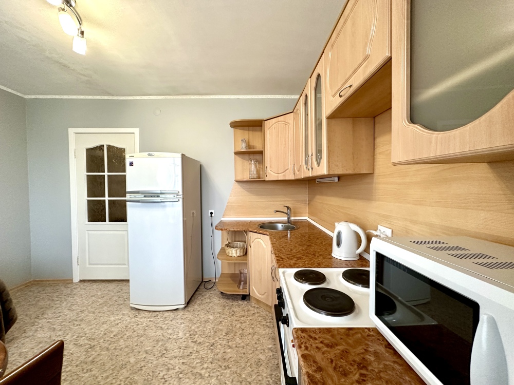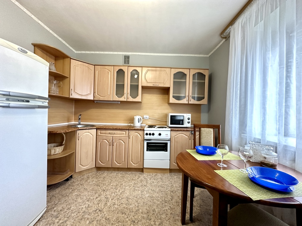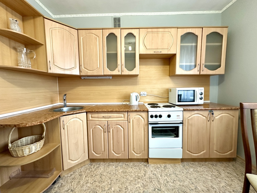 - Современная бытовая техника: варочная панель, вытяжка, двухкамерный холодильник, электрочайник, СВЧ, фен, утюг, стиральная машина.