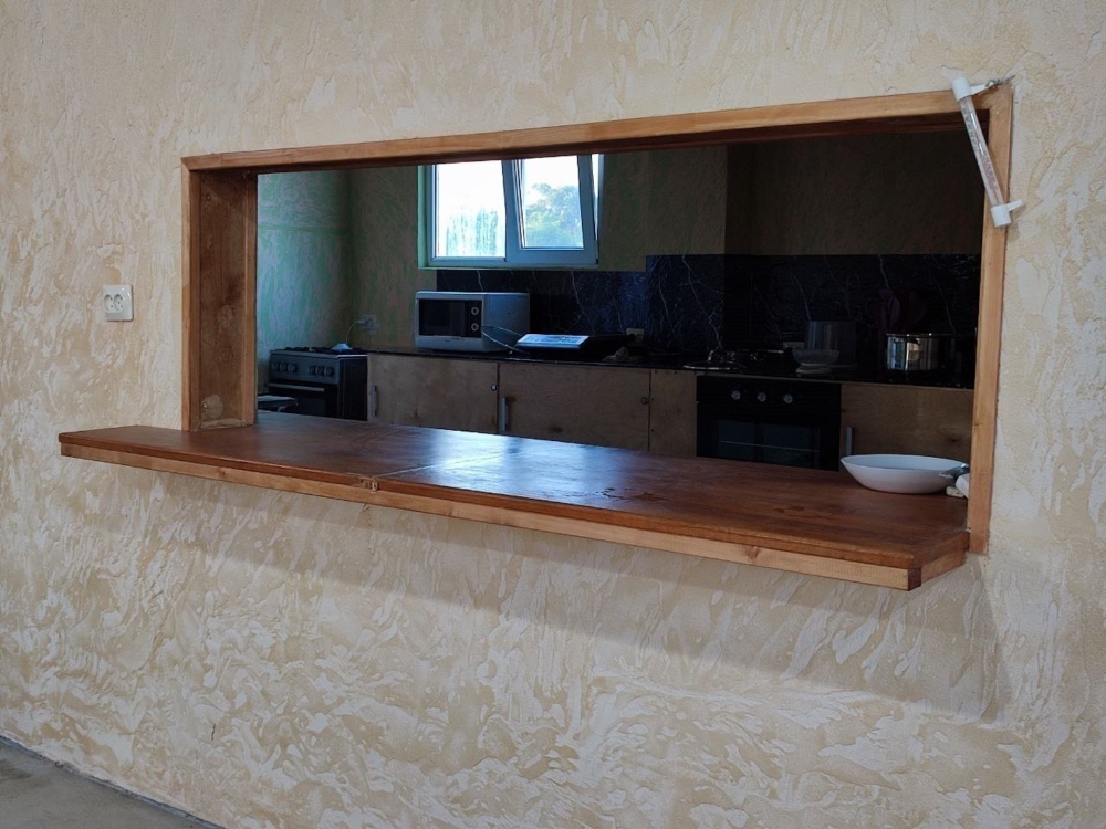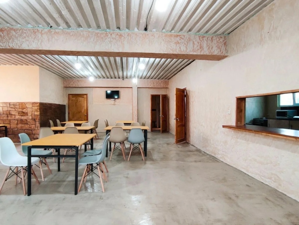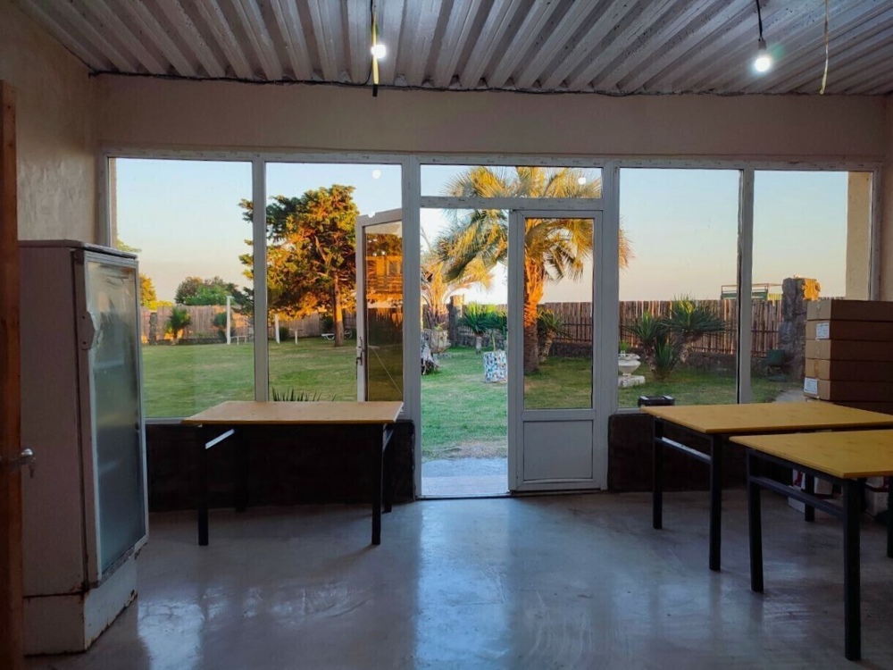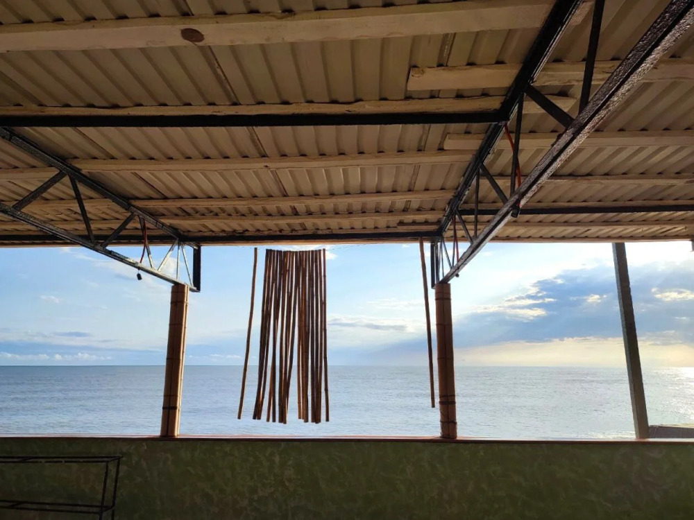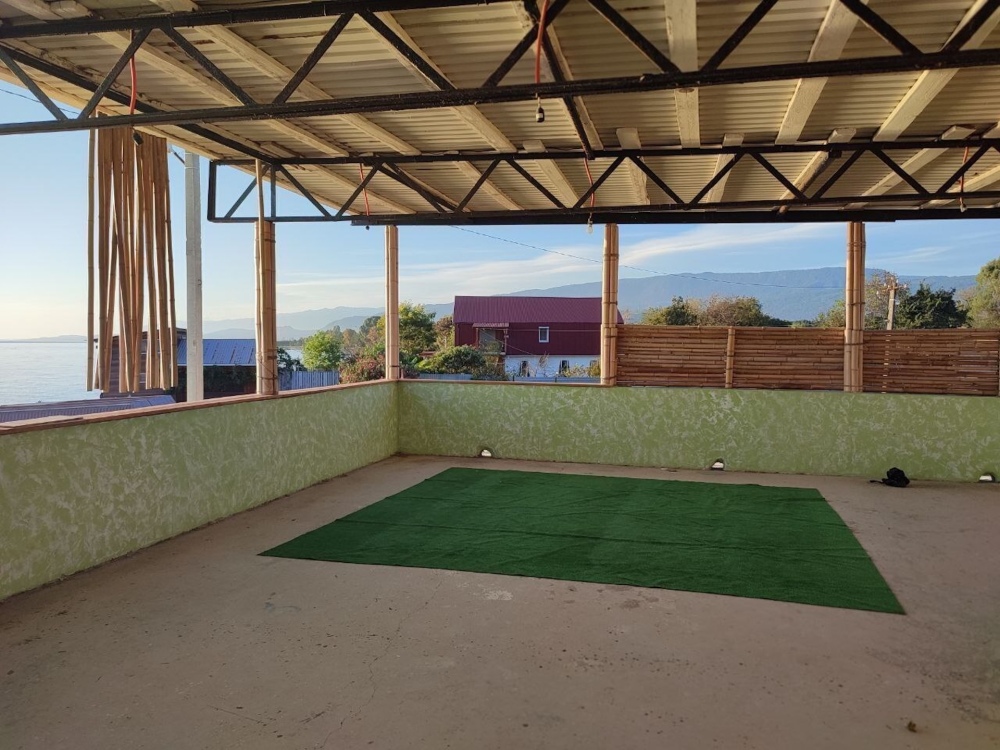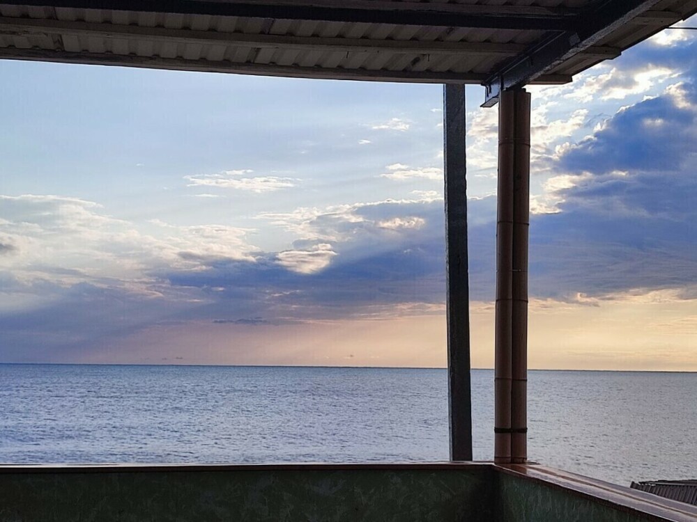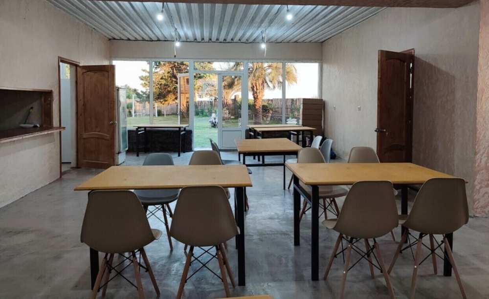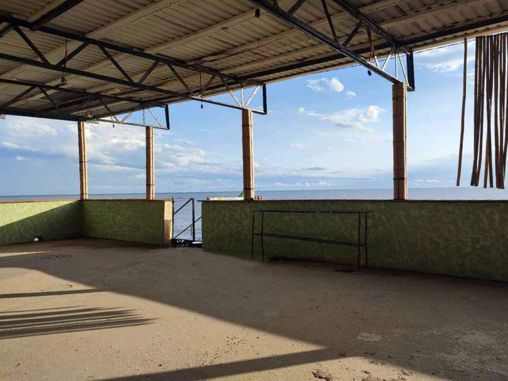 Столовая работает с 8:00 до 20:00 и не рассчитана на самостоятельное приготовление еды. Над столовой находится веранда 100м2 с видом на море. Бетонное основание, искусственное покрытие «трава», мебель из паллетов. Свободный доступ к прекрасному виду на море и спасение от жары.