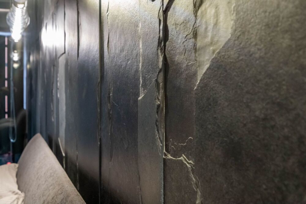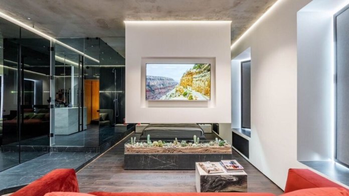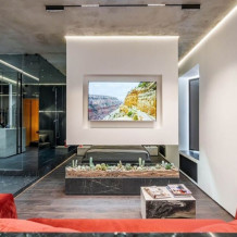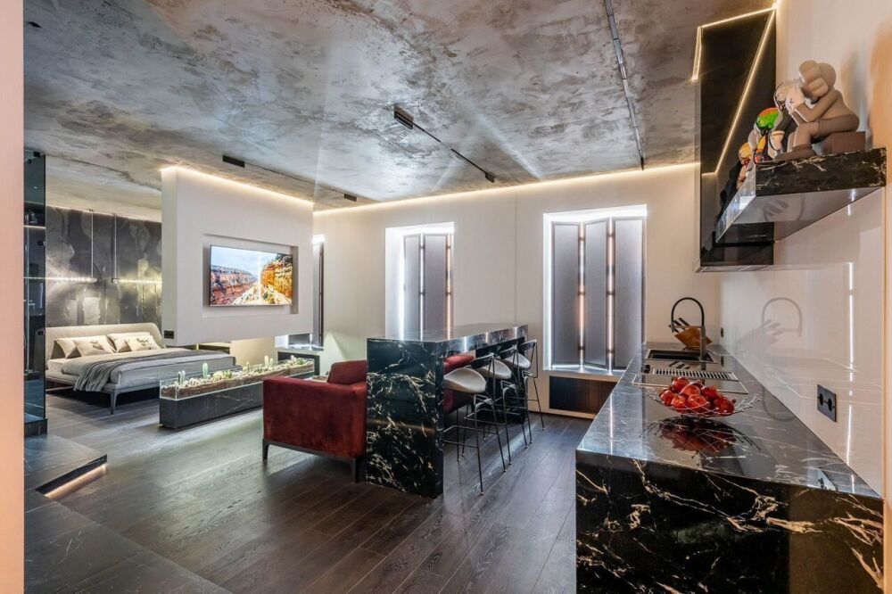 Каждая деталь здесь продумана до мелочей, начиная с нестандартного зонирования всего пространства студии, заканчивая авторской сантехникой, привезенной из Европы. Несмотря на небольшую площадь здесь есть полноценная кухня с духовым шкафом и плитой-гриль, гостиная зона с удобной мягкой мебелью, спальня, огромная ванная комната и даже сауна, которая нагревается до 110 градусов.