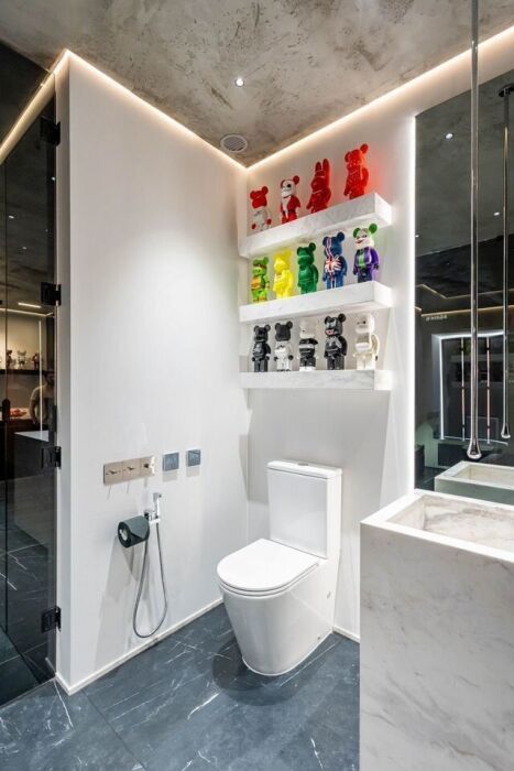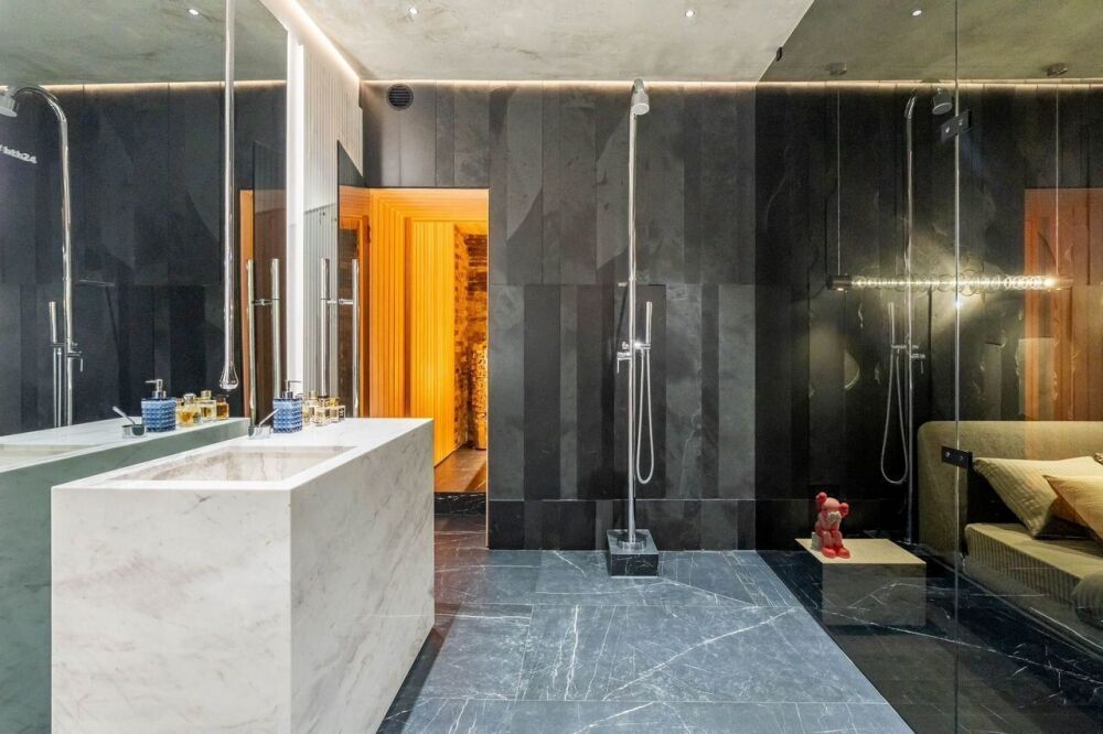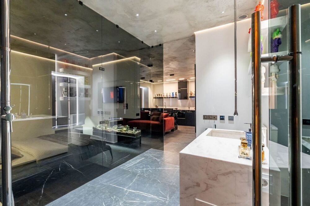 Настоящей изюминкой апартаментов является душевая. Мы полностью снесли все стены и вместо них поставили стеклянные перегородки. А грамотно продуманное освещение позволило создать невероятную атмосферу.