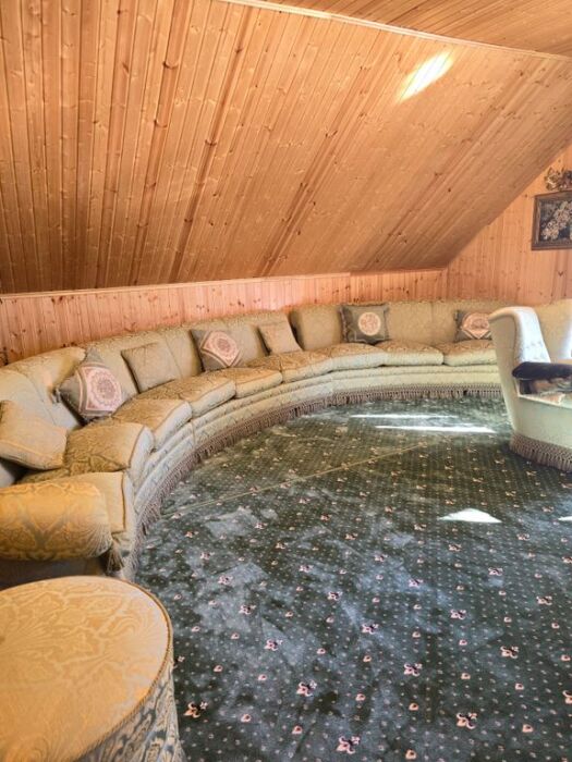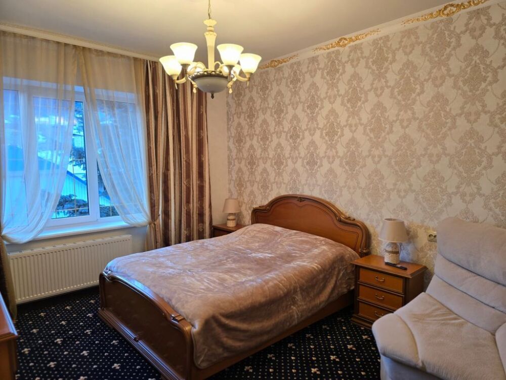 Имеет спальню с приятным интерьером, витражными окнами и балконом.