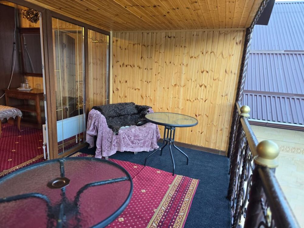 Имеет спальню с приятным интерьером, витражными окнами и меблированным столом и стульями балконом.