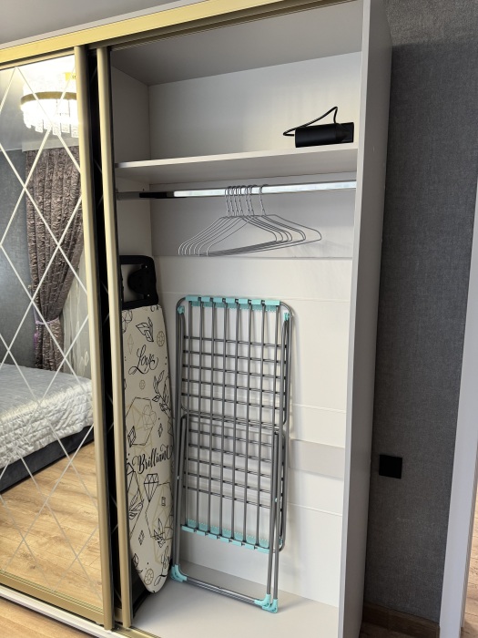 В квартире есть шкаф, в котором находится фен, утюг, гладильная доска сушилка для одежды, полотенца.