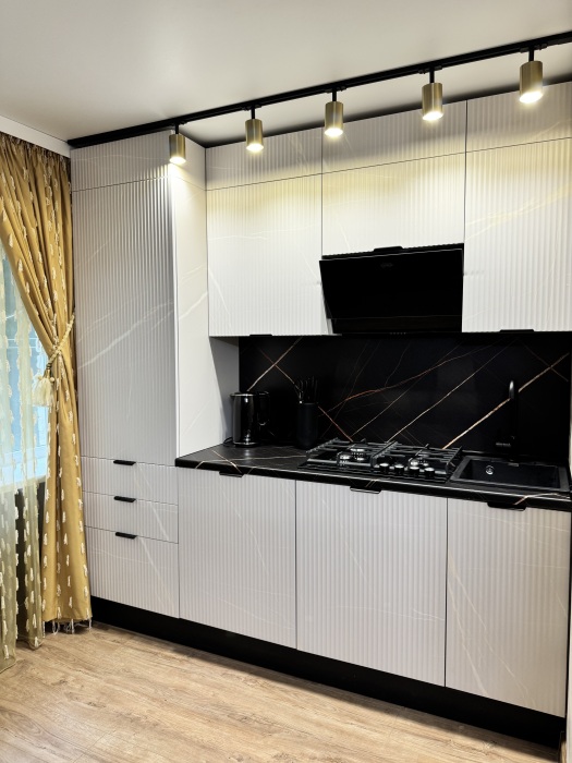 На кухне чайник, встроенный холодильник, микроволновая печь, варочная панель, столовые приборы, посуда, кастрюля и сковородка, также большой стол, моющие средства для Вашего удобства.