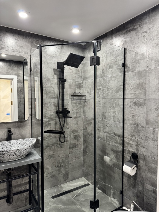 В санузле душевая кабина, туалет, раковина, большое зеркало с подсветкой, полотенцесушитель, мыло для рук, туалетная бумага и освежитель воздуха.