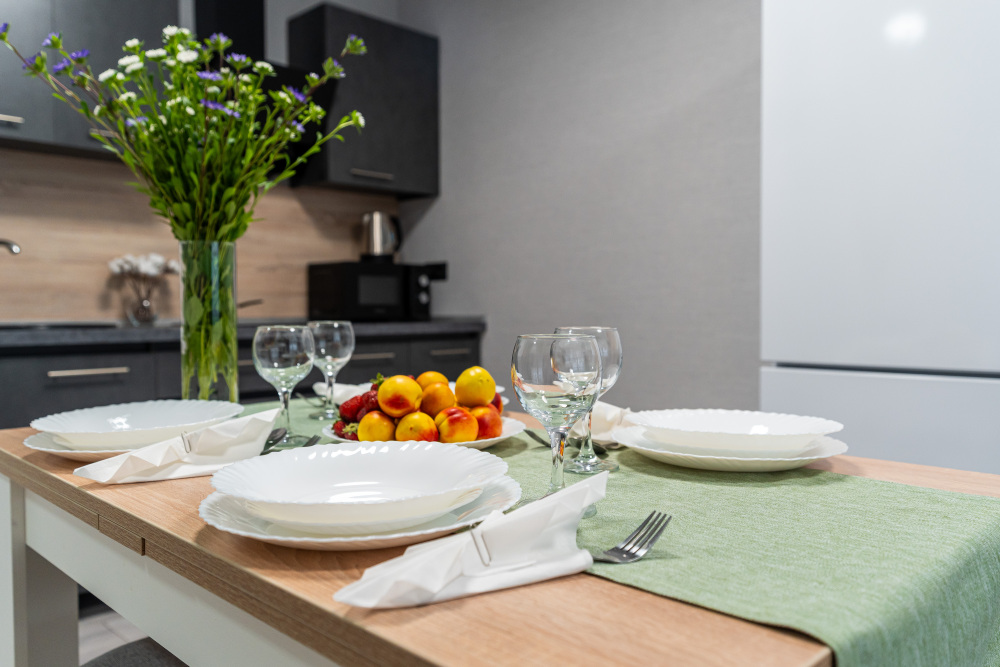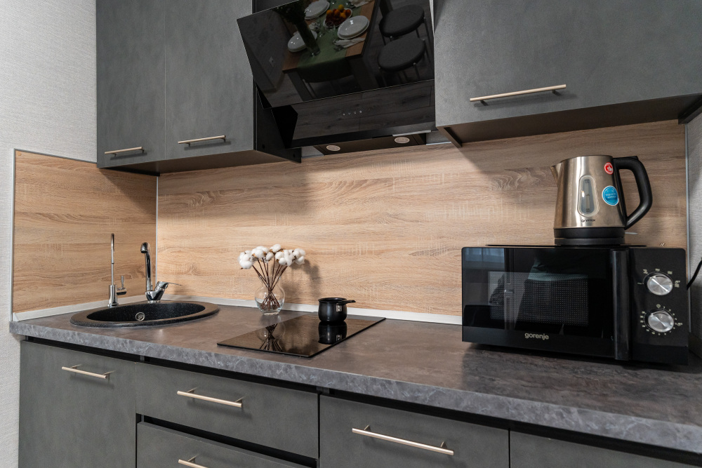 - Полностью оборудованная кухня с современными приборами и полным набором посуды.